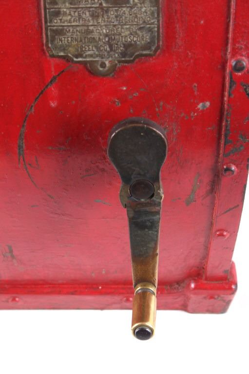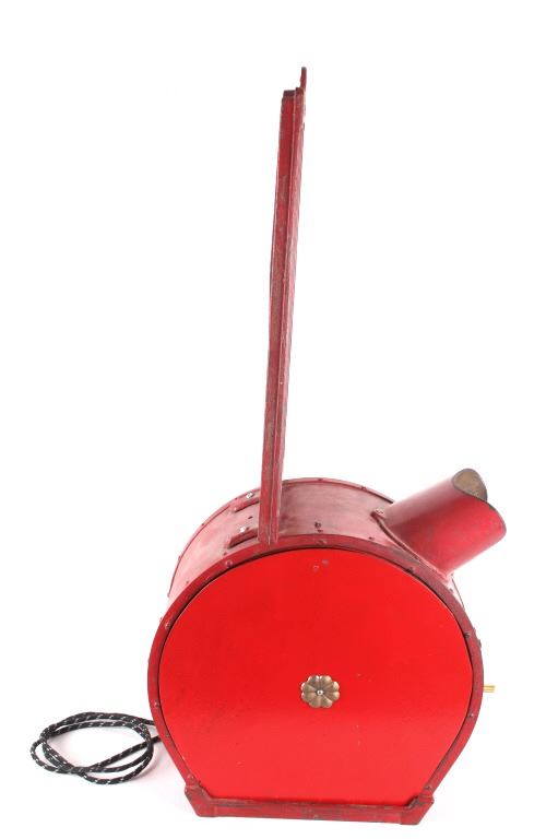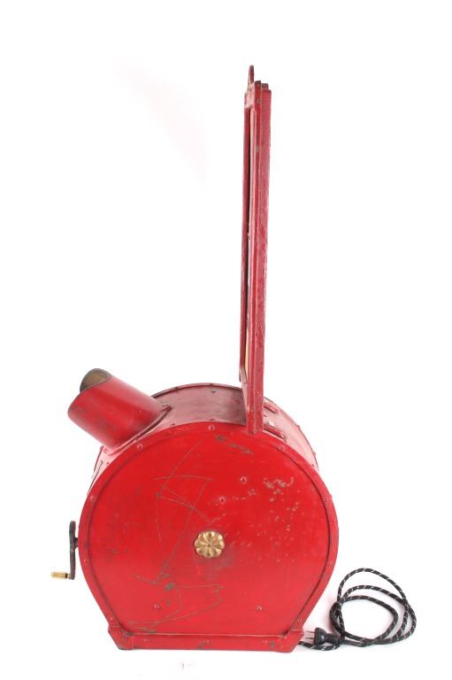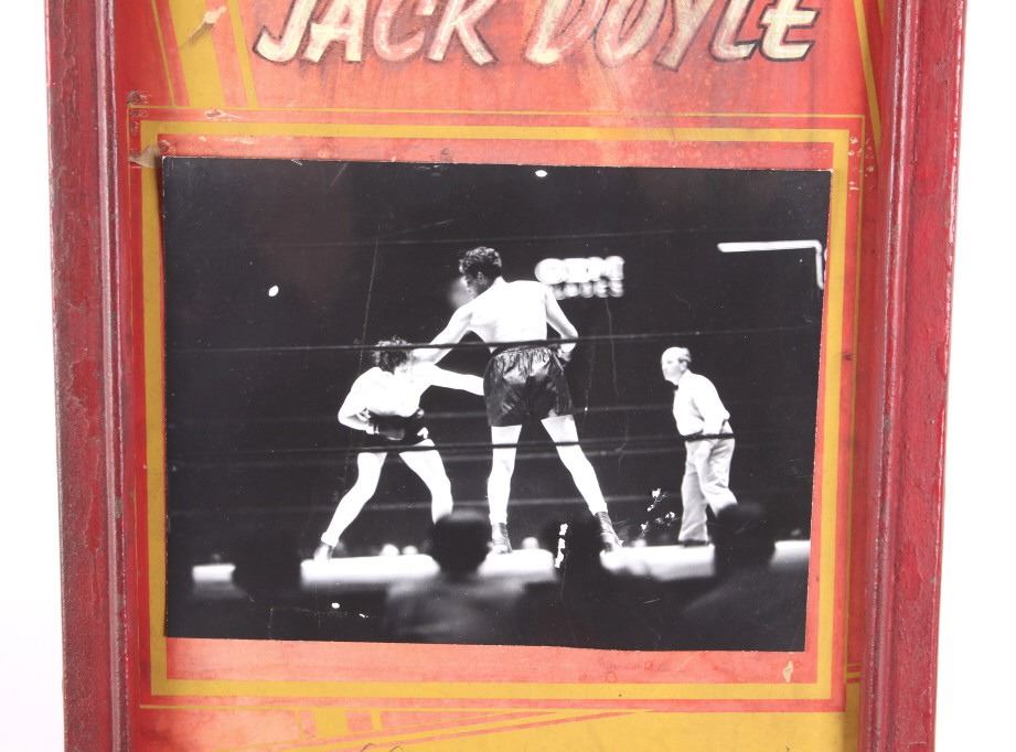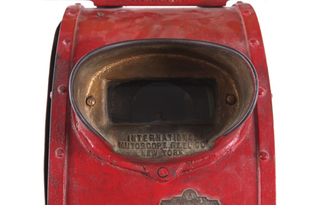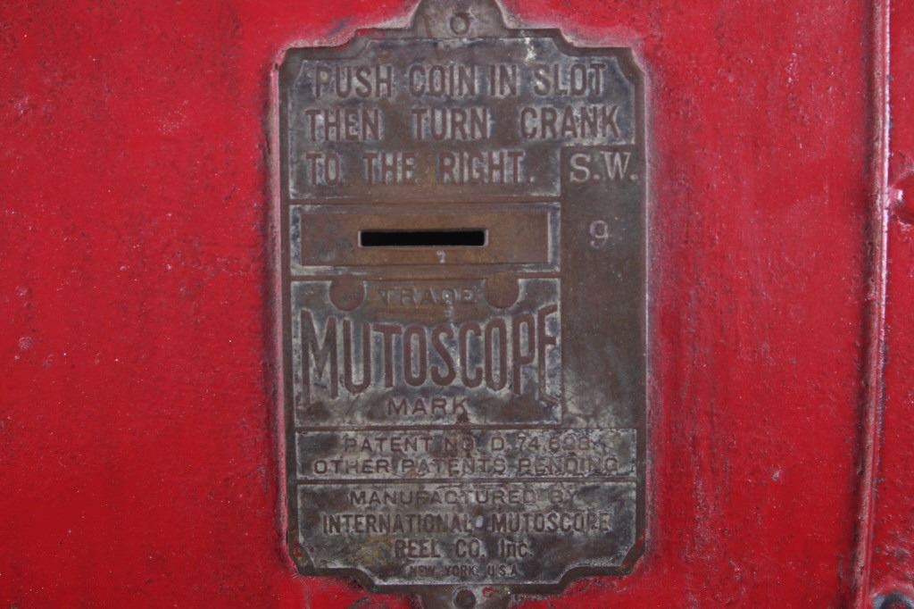 Featured in this lot is this International Mutoscope Co. reel movie viewer. The viewer features marking at the bottom of the sign reading Patented - International Mutoscope Co. Inc. - New York, U.S.A. The viewer is marked near the lens reads: International Mutoscope Co. - New York. The viewer shows that it works and has been plugged in and shows a scene from Charlie Chaplan where he performs slapstick comedy on the street with a guy that comes out of a store. The advertisement of the sign is of Buddy Baer K.O.'s Jack Doyle and features a photograph of the K.O. underneath the title. To operate the machine you plug it in and turn the spindle located underneath the lens and it turns the reel inside the machine. The condition of this mutoscope reel machine is fair to good with a nail holding the reel compartment closed and shows some modern repair to the sign on top of the machine but is in otherwise fair to good overall condition. The measurements of this machine are 40 1/4" x 11 3/4" x 20 1/2".