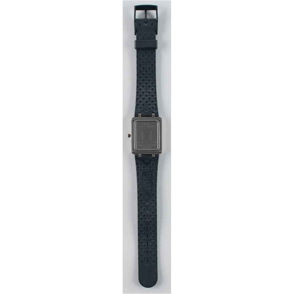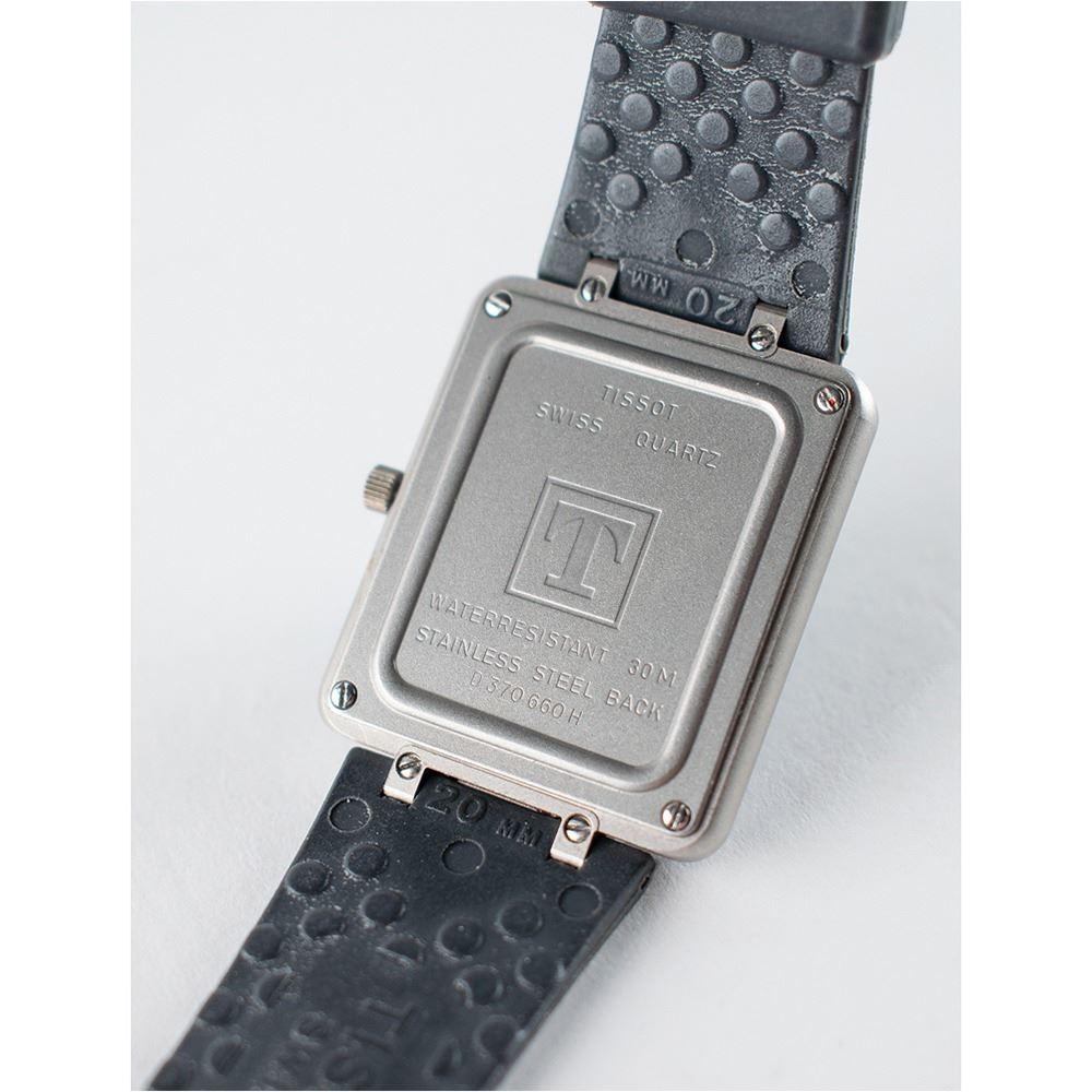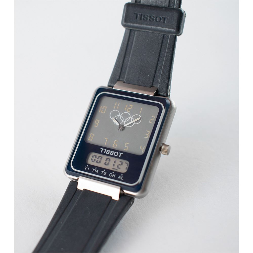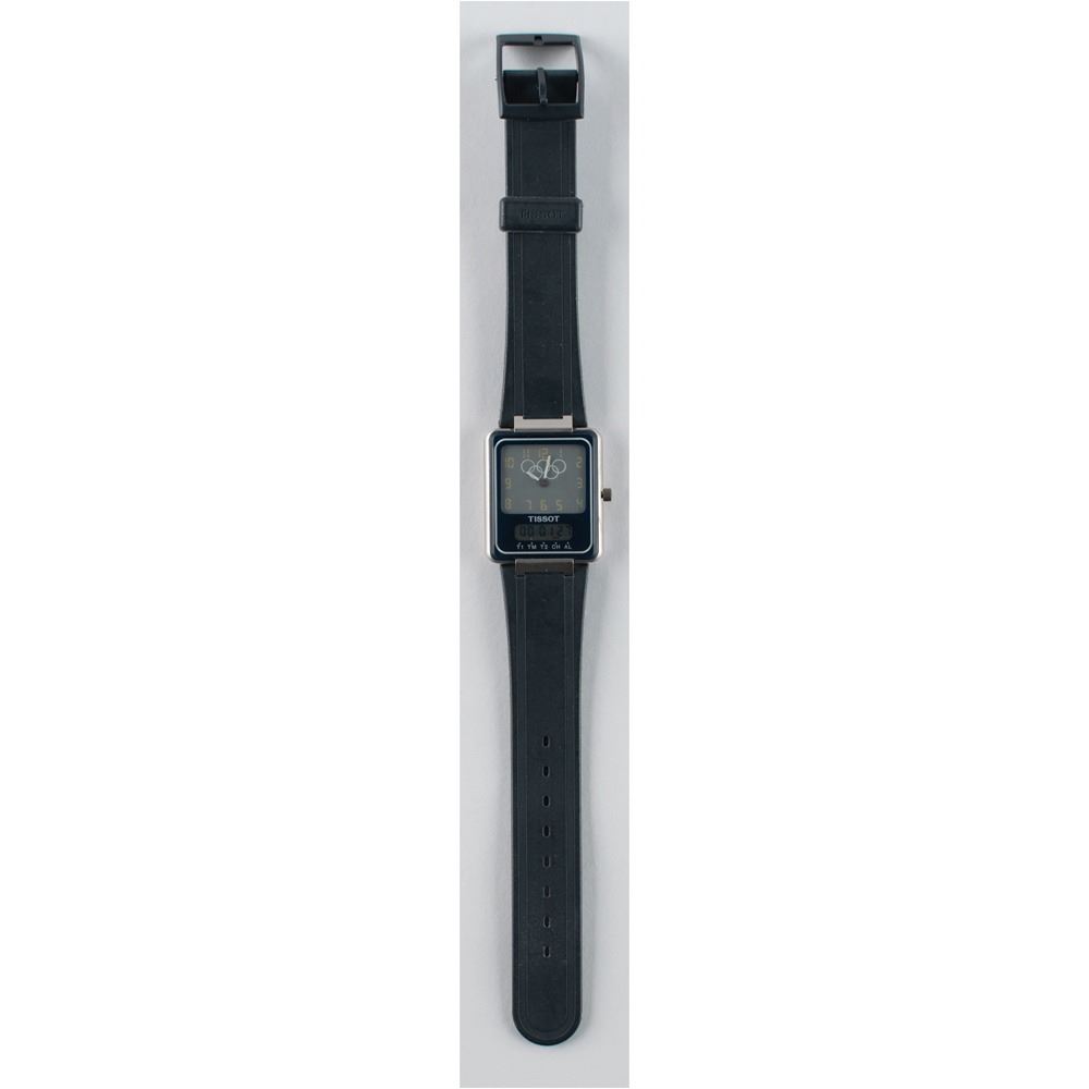 Scarce Olympic analog-digital watch by Tissot (D 370 660 H) presented to members of the International Olympic Committee, measuring 9Ë in length, with stainless steel back, rubber strap, and white Olympic rings against a gray dial. This watch was never sold commercially. In fine condition.