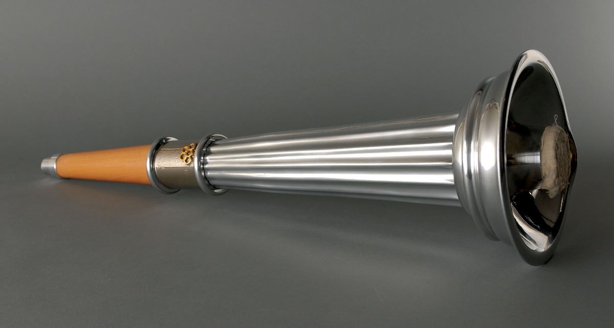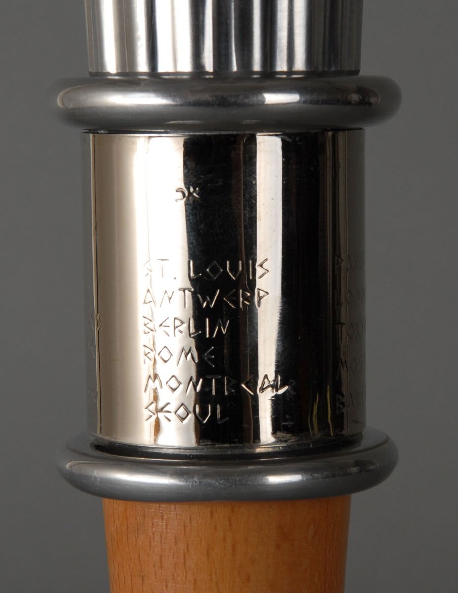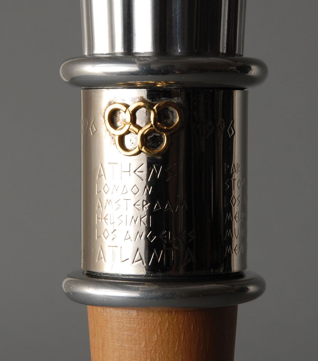 Uncommon official International Olympic committee (IOC) centennial torch, constructed of aluminum and wood, measuring 21.75?in length and 6? at its widest point. The main body is ribbed in a fashion similar to the twenty-two reeds found on the Atlanta torch, with a band above the wooden handle engraved with the Olympic rings and all the host cities and their dates since 1896. Trivial wear to the handle, and a dent to the upper rim. This unique torch was lit in Greece on March 30, 1996, and designed specifically for use at an event in Athens hosted by the Hellenic Olympic Committee to celebrate the 100th anniversary of the first modern Games. Representatives from each host city since 1896 attended and participated in a torch run inside Athens Olympic Stadium using these torches.