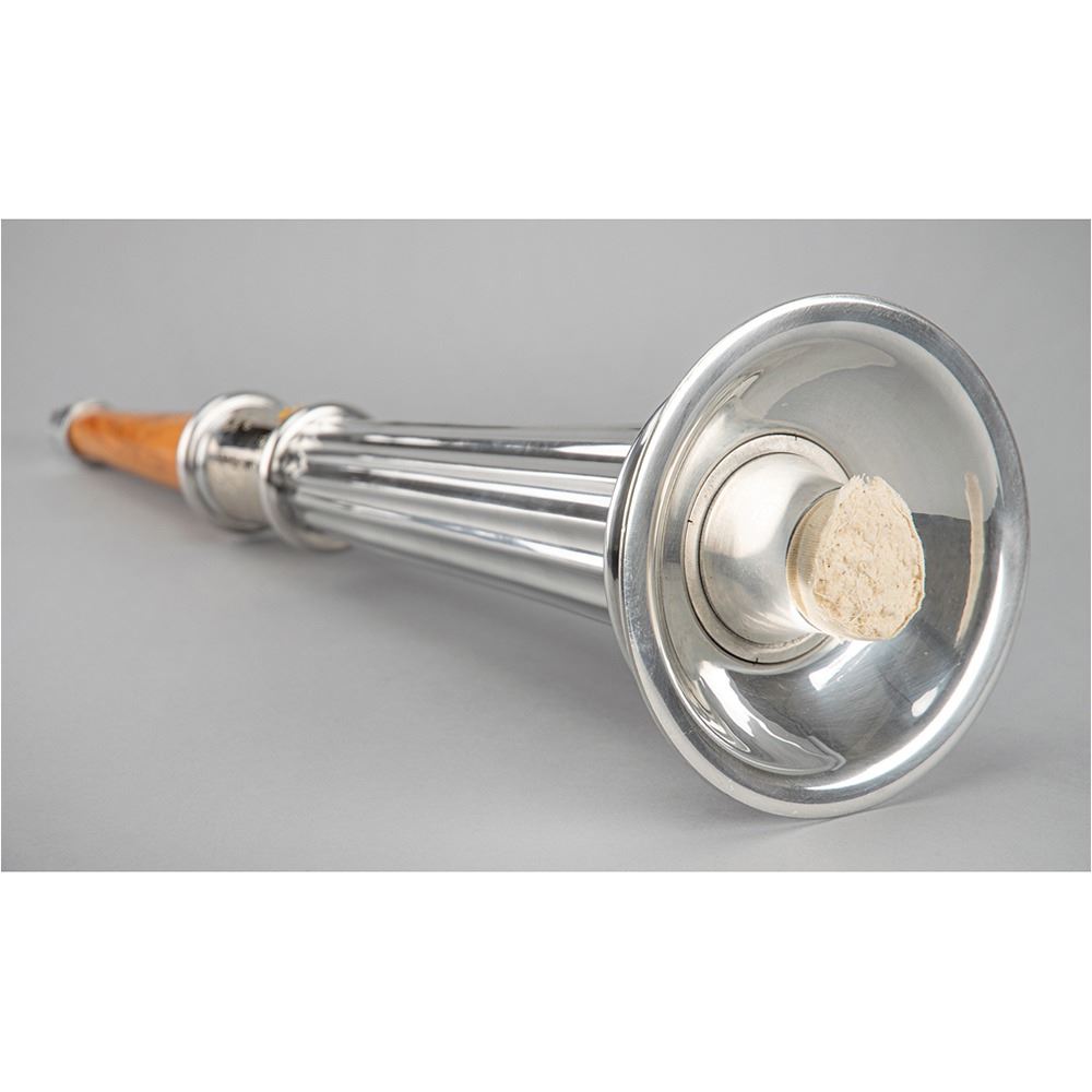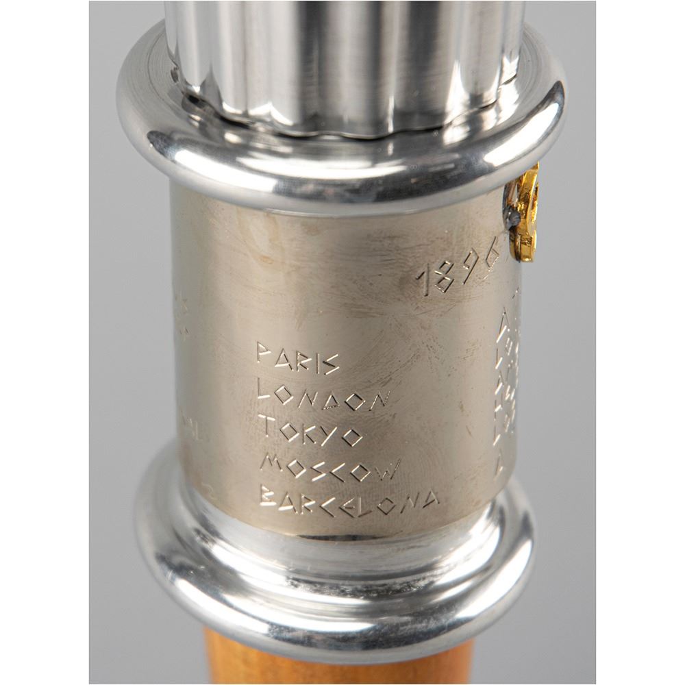 Uncommon official International Olympic committee (IOC) centennial torch, constructed of aluminum and wood, measuring 21.75″ in length and 6″ at its widest point. The main body is ribbed in a fashion similar to the twenty-two reeds found on the Atlanta torch, with a band above the wooden handle engraved with the names of all the host cities and their dates since 1896; bottom ring slightly loose from band. An example of this unique torch was lit in Greece on March 30, 1996, and designed specifically for use at an event in Athens hosted by the Hellenic Olympic Committee to celebrate the 100th anniversary of the first modern Games. Representatives from each host city since 1896 attended and participated in a torch run inside Athens Olympic Stadium using these torches. An elegant, unused torch commemorating one hundred years of Olympic excellence.