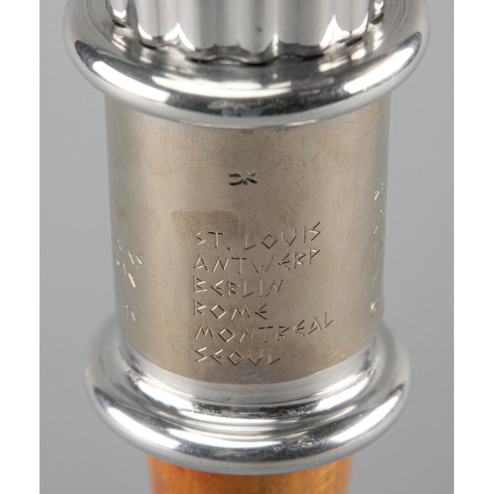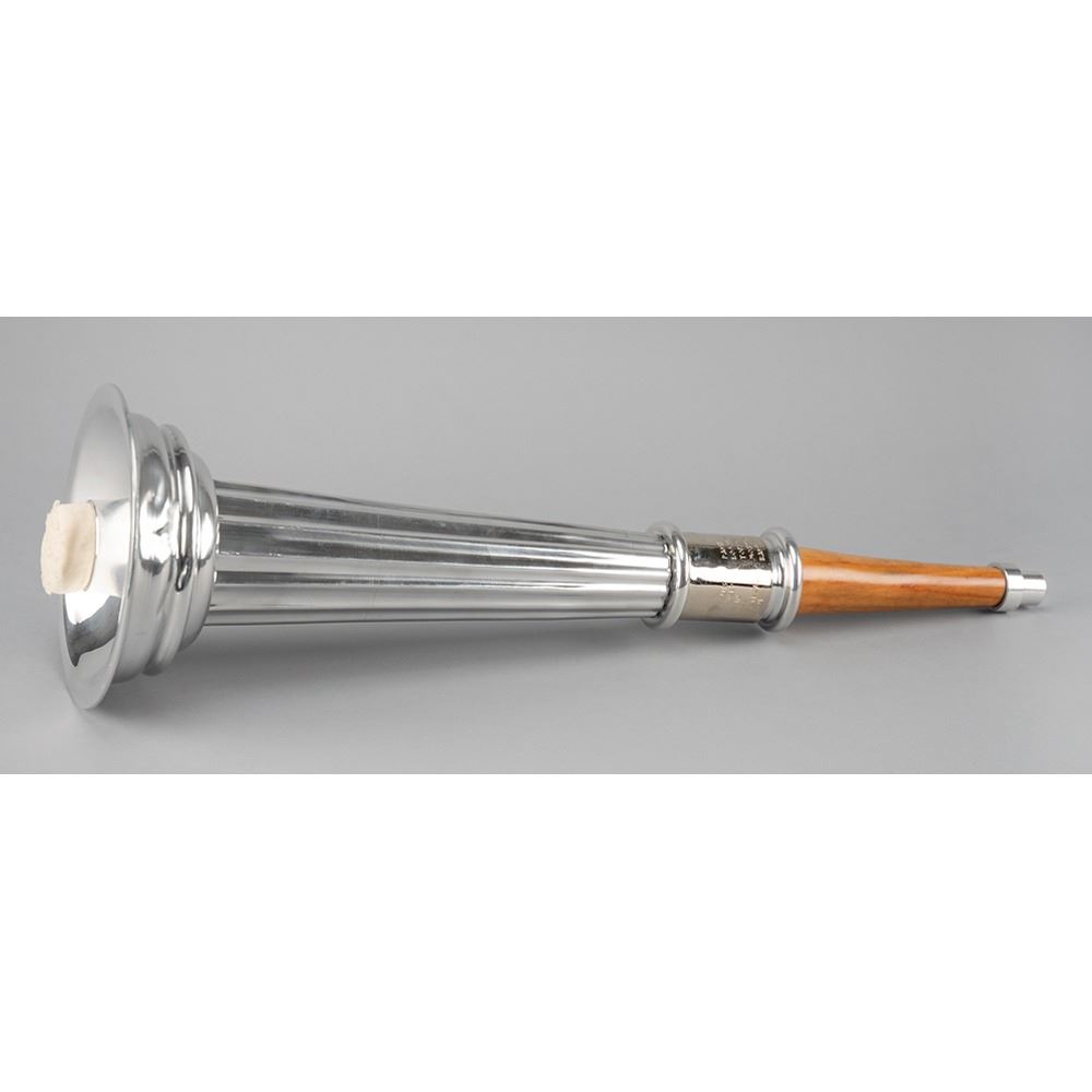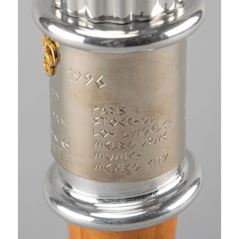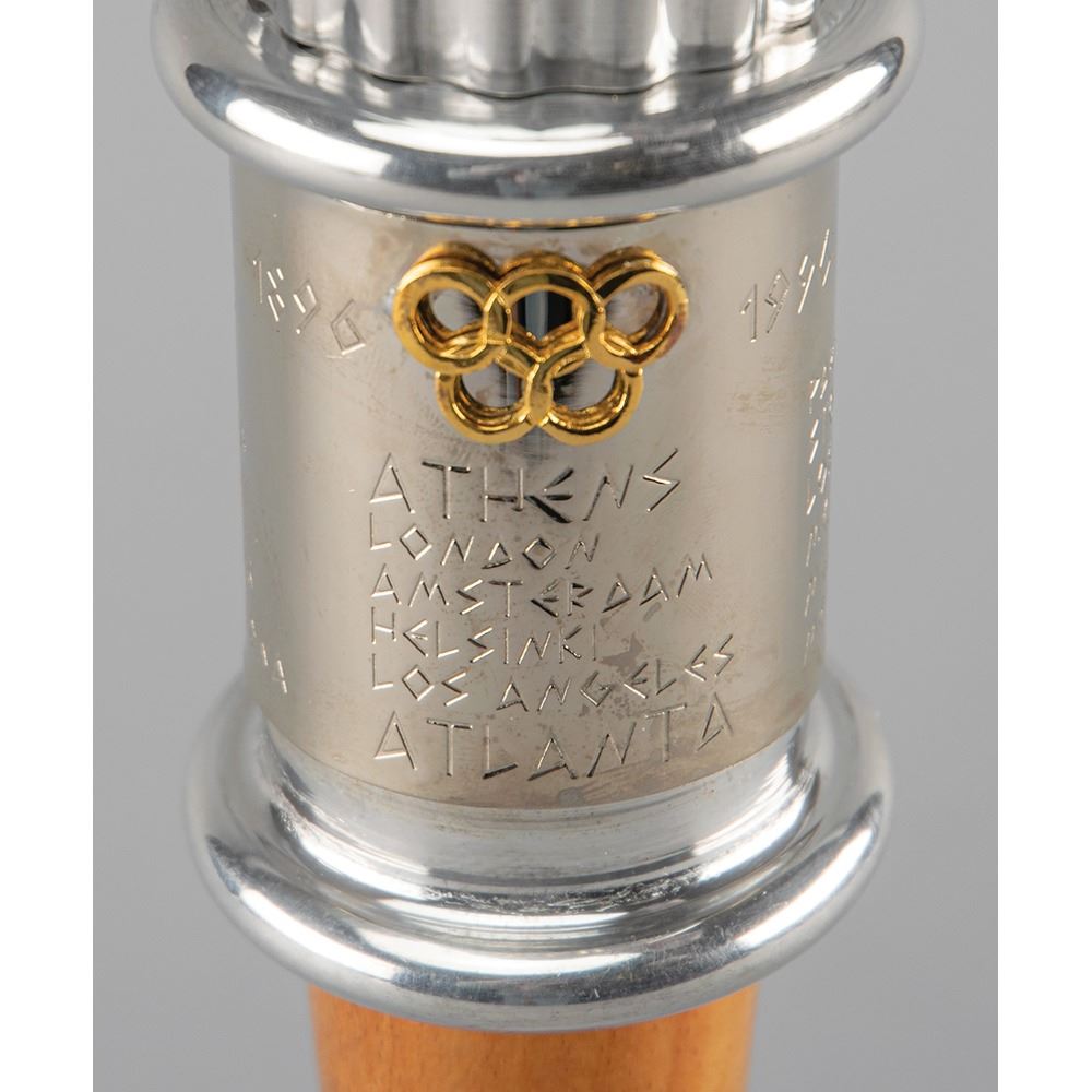 Uncommon official International Olympic committee (IOC) centennial torch, constructed of aluminum and wood, measuring 21.75″ in length and 6″ at its widest point. The main body is ribbed in a fashion similar to the twenty-two reeds found on the Atlanta torch, with a band above the wooden handle engraved with the names of all the host cities and their dates since 1896; bottom ring slightly loose from band. An example of this unique torch was lit in Greece on March 30, 1996, and designed specifically for use at an event in Athens hosted by the Hellenic Olympic Committee to celebrate the 100th anniversary of the first modern Games. Representatives from each host city since 1896 attended and participated in a torch run inside Athens Olympic Stadium using these torches. An elegant, unused torch commemorating one hundred years of Olympic excellence.