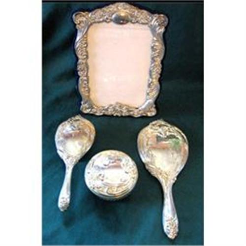 <table width="100%" border="0" cellspacing="0" cellpadding="4"><tr><td><em> </em></td></tr><tr> <td width="100%"> Produced by the International Silver Co this 5 pc silver plated dresser set includes a hand mirror, brush, powder jar and picture frame. The frame is for measures 10 1/4"x7 1/4" and takes a 6" x8 " picture, the jar is almost 4" in diameter, the brush is about 8 3/4" tall, the mirror is about 10 3/4" tall. All in excellent, probably unused, condition </td></tr><tr> <td> </td></tr><tr> <td>Reference #: aaISCPVS</td></tr><tr><td>Condition:Excellent</td></tr><tr><td>Year:Unknown</td></tr><tr><td>Title:International Silver Co Silver Plate Vanity Set</td></tr><tr><td>Location:Orlando, Florida</td></tr></table>