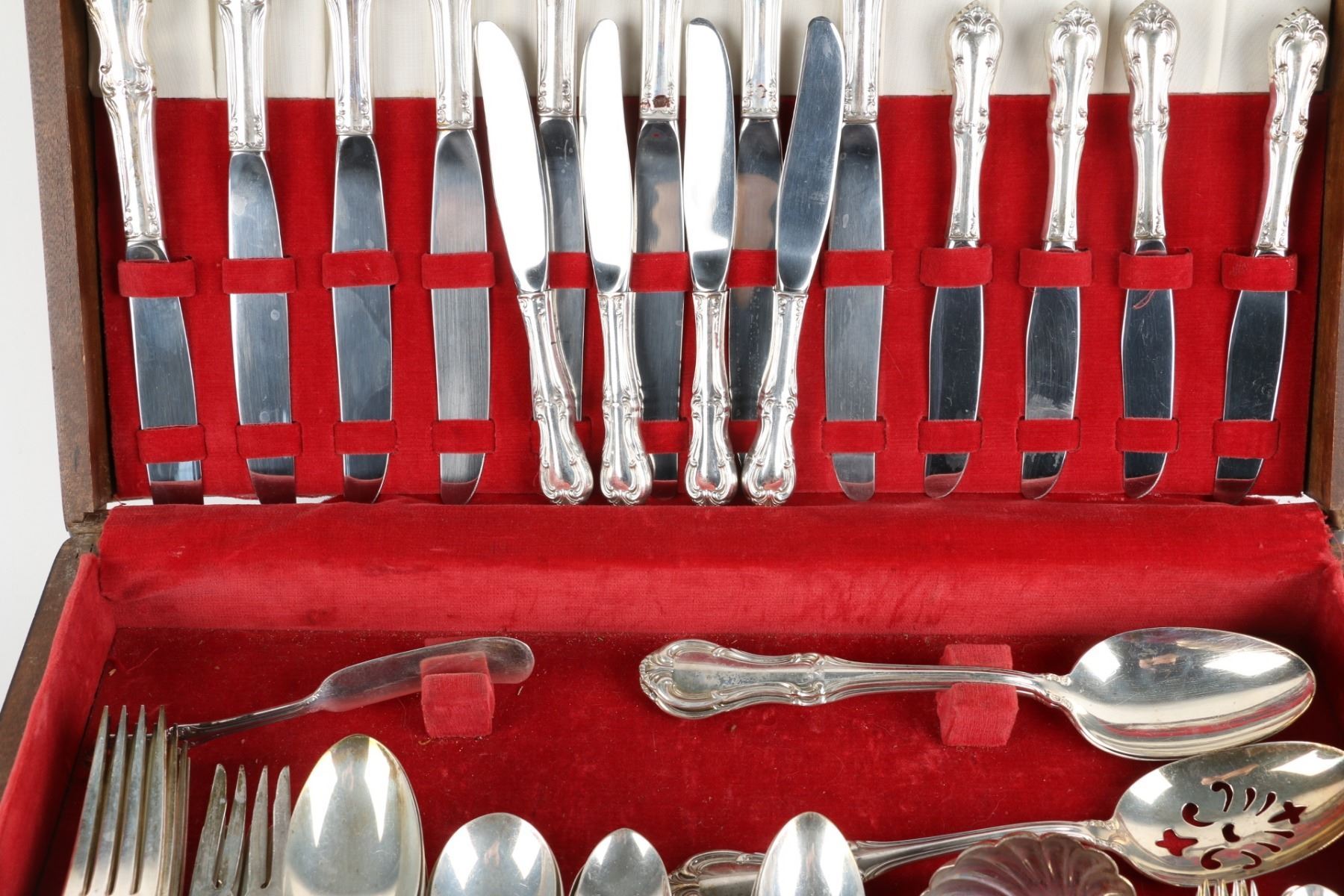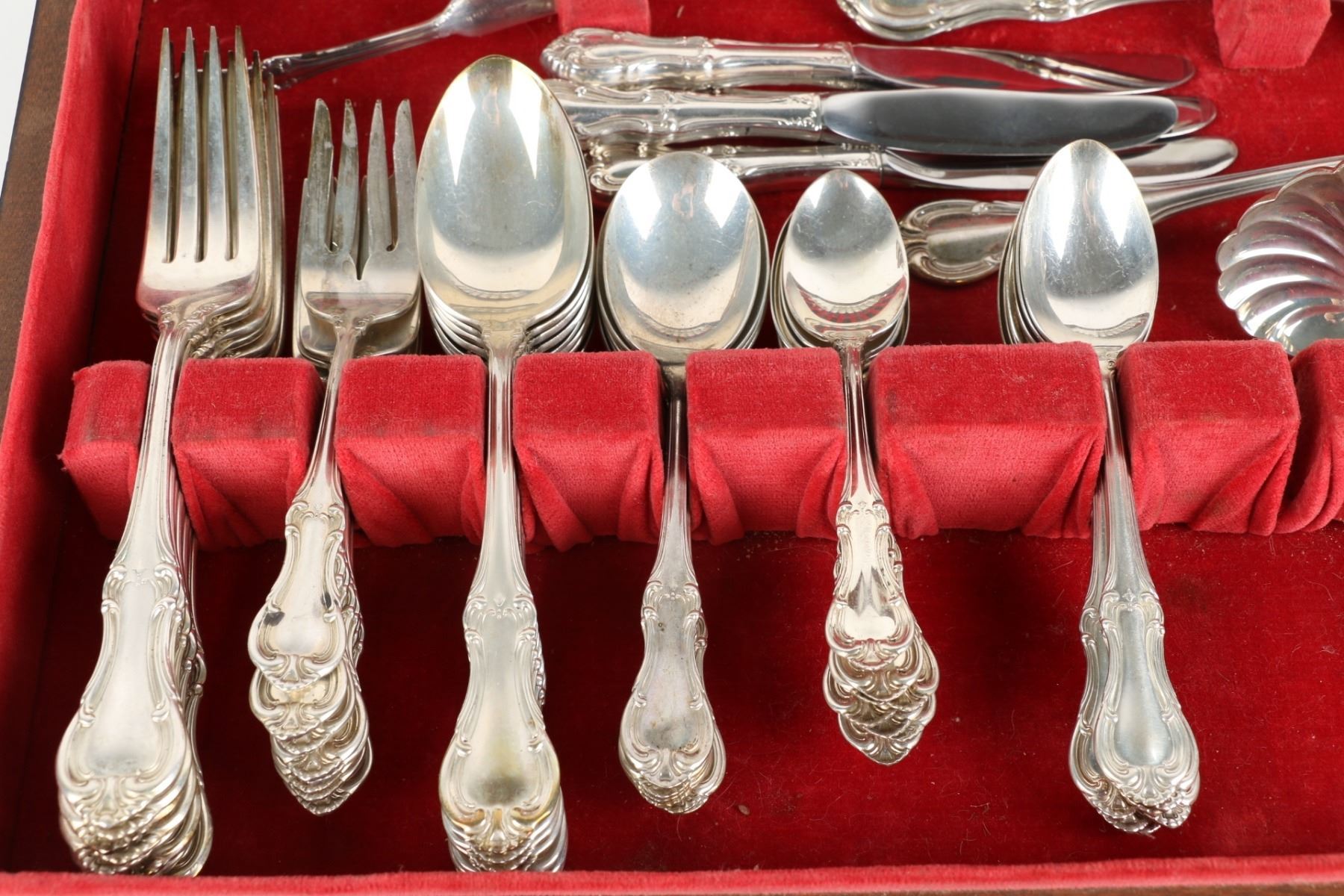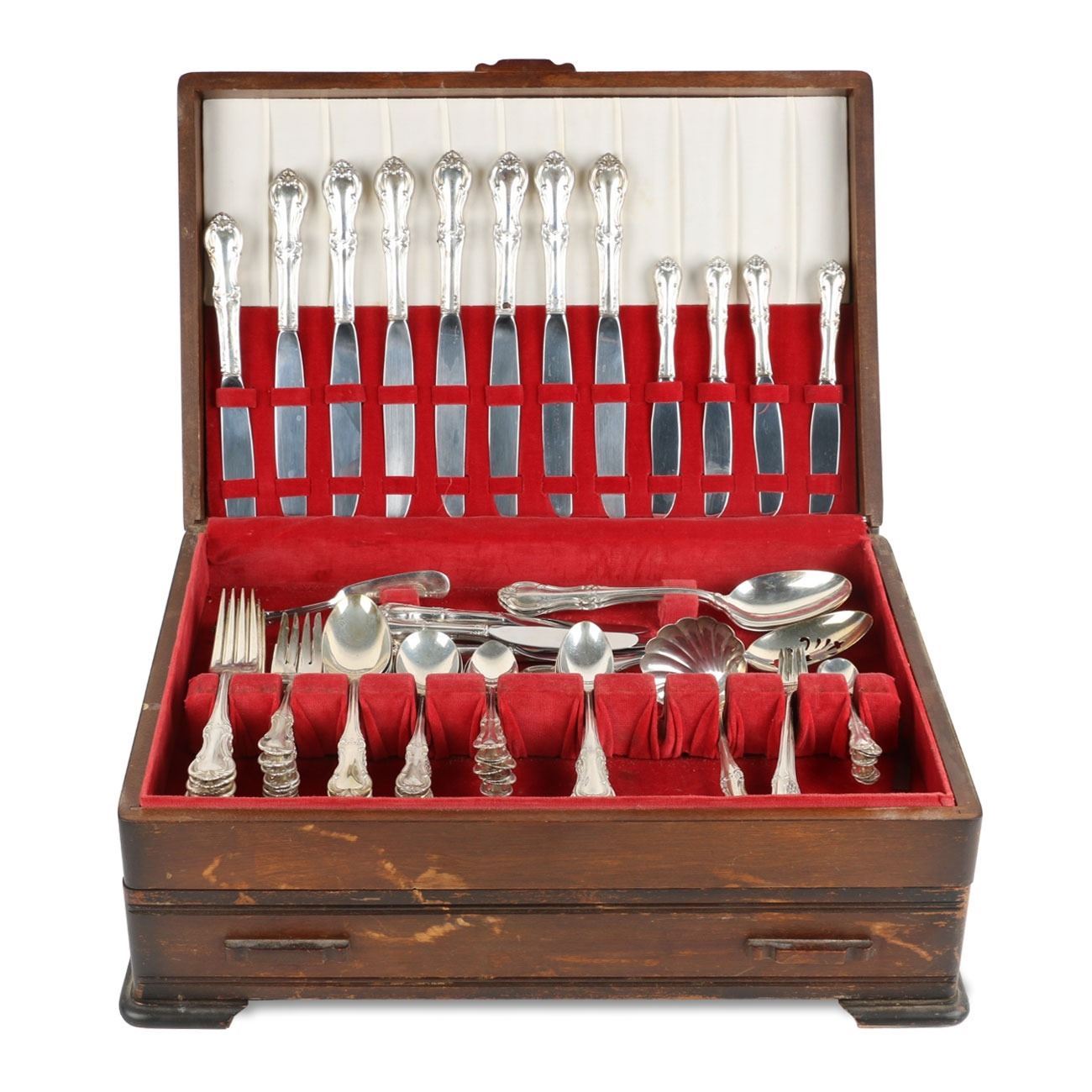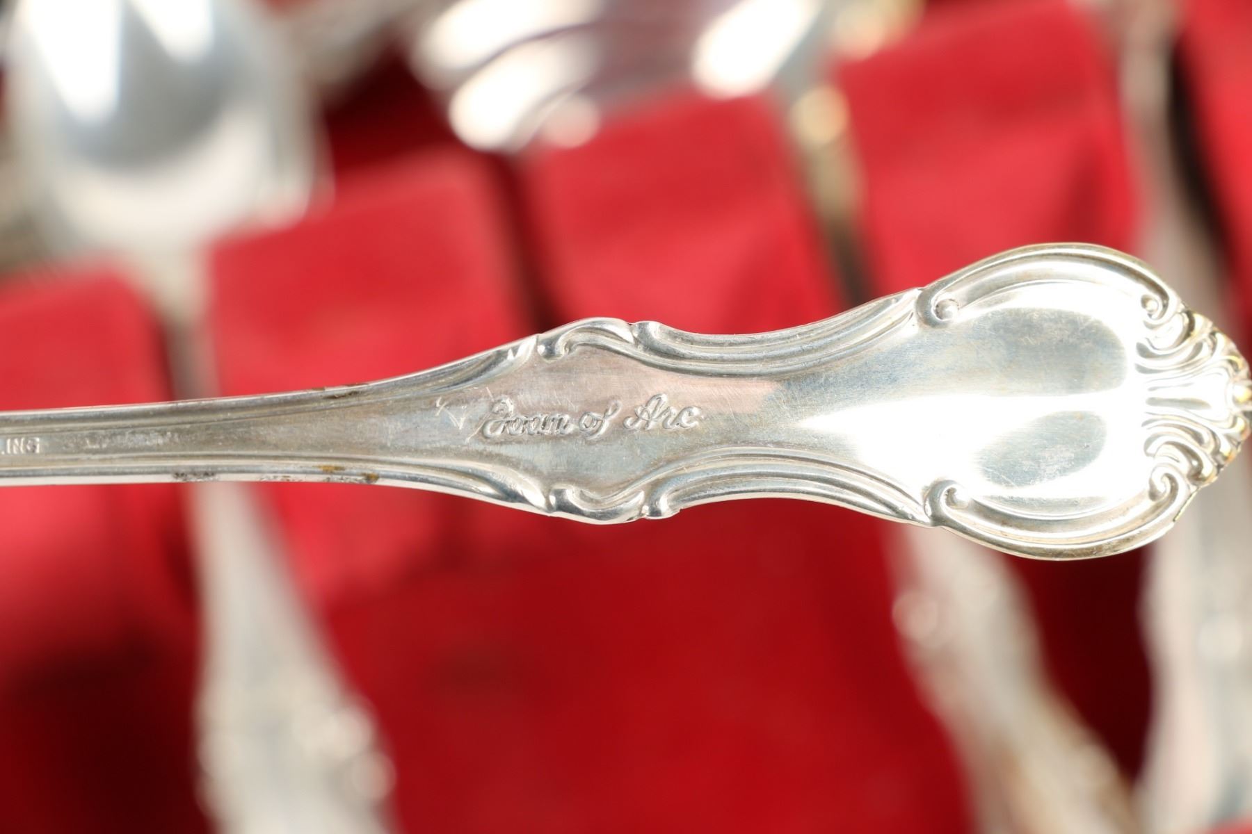 Lot 256 - American. Eight (8) place settings (82 pieces). "Joan of Arc" pattern. 8 dinner forks, 8 dinner spoons, 8 dessert forks, 6 soup spoons, 8 tea spoons, 8 five o'clock spoons, 8 dessert spoons, 8 seafood forks, 3 serving spoons, 1 butter knife, 8 dinner knives, 8 dessert knives. Gross weight forks, spoons and serving pieces 2328g; knives 962g (hollow Sterling handle). Longest piece, 8.5". $1500-2000.