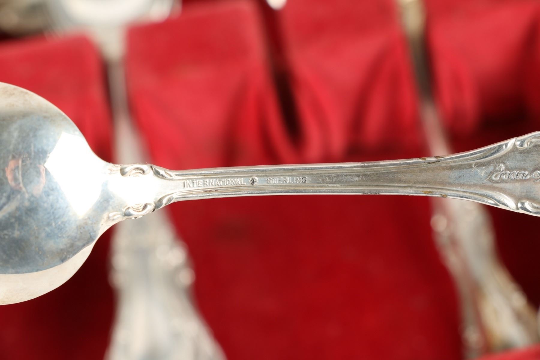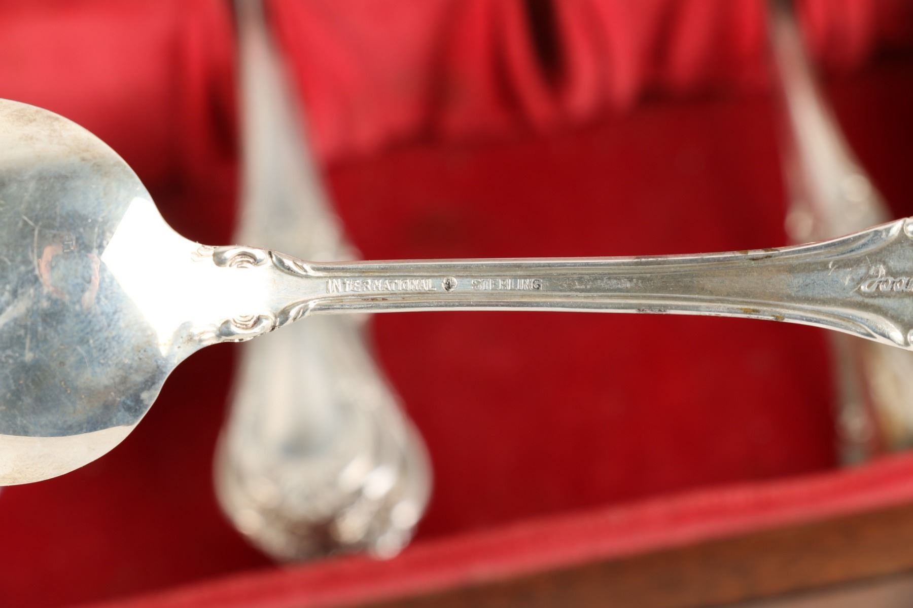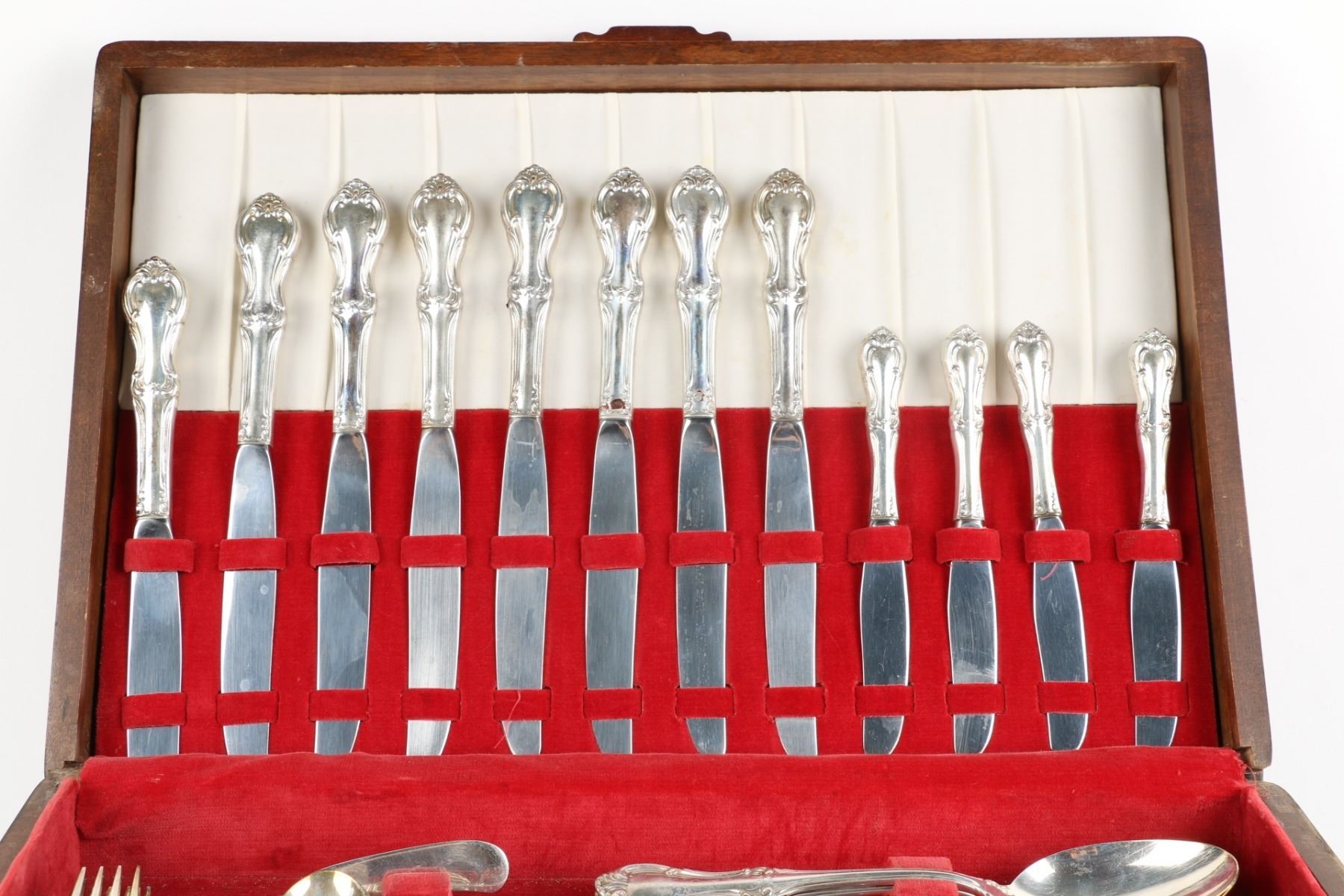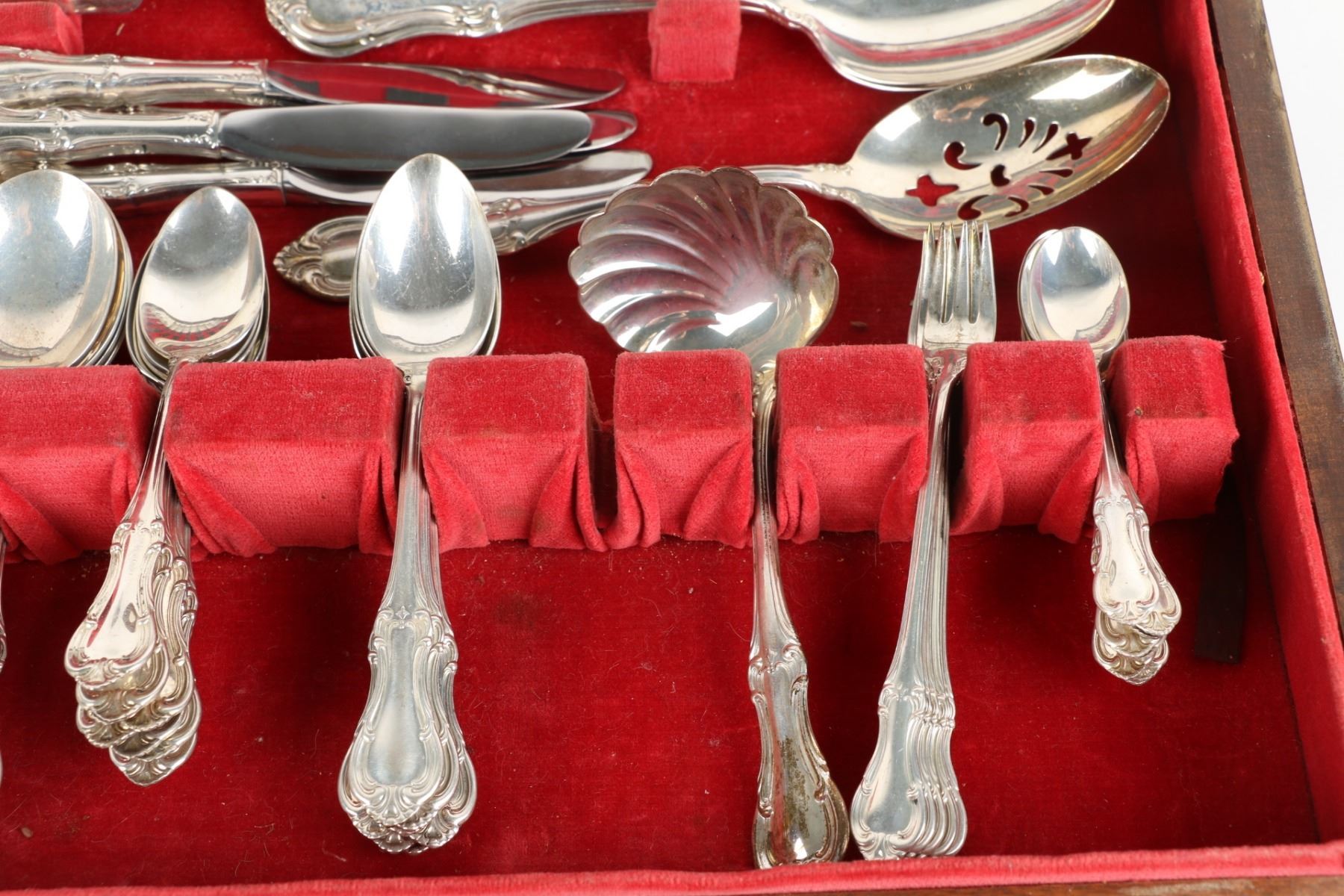 Lot 256 - American. Eight (8) place settings (82 pieces). "Joan of Arc" pattern. 8 dinner forks, 8 dinner spoons, 8 dessert forks, 6 soup spoons, 8 tea spoons, 8 five o'clock spoons, 8 dessert spoons, 8 seafood forks, 3 serving spoons, 1 butter knife, 8 dinner knives, 8 dessert knives. Gross weight forks, spoons and serving pieces 2328g; knives 962g (hollow Sterling handle). Longest piece, 8.5". $1500-2000.