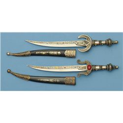 Manufacturer: None Model: None Both with 6 1/4 inch blades and sheaths. CONDITION: Very good overall with one sheath missing a small decorative pi