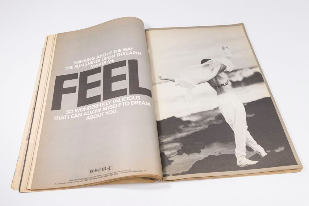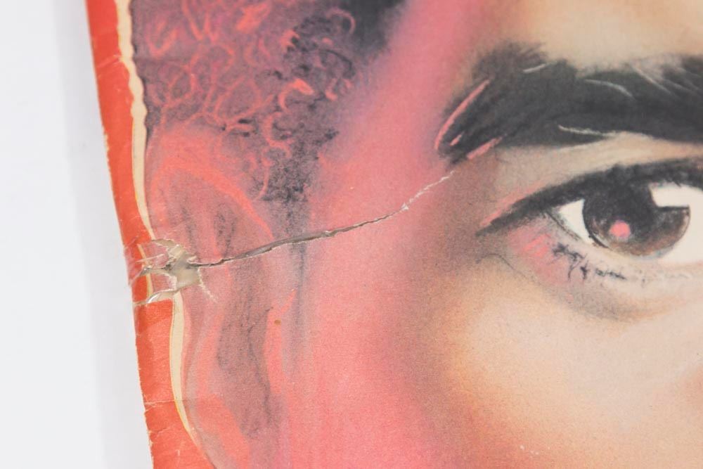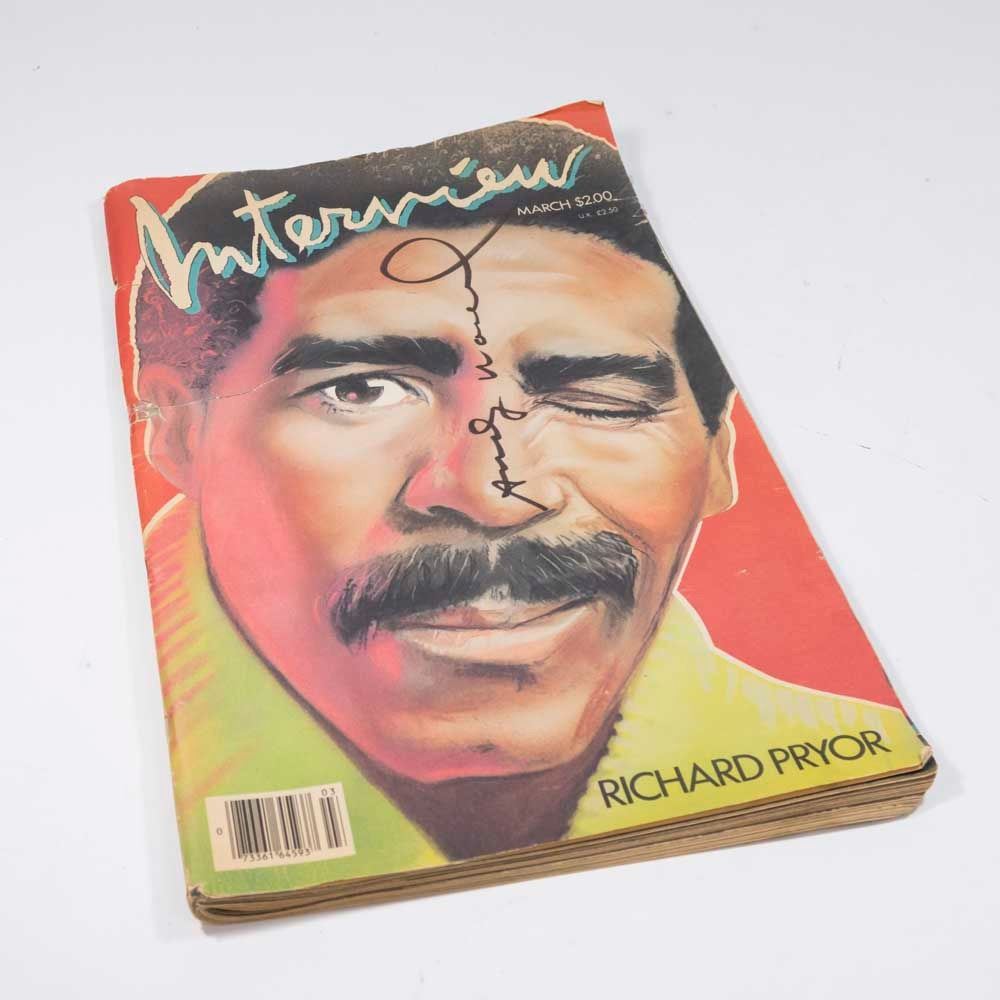 March 1986. Richard Pryor. Signed for owner by Andy Warhol. Approx. 17" x 11". Damages and tear at binding. Fading and wear.