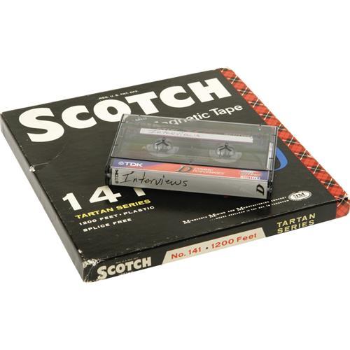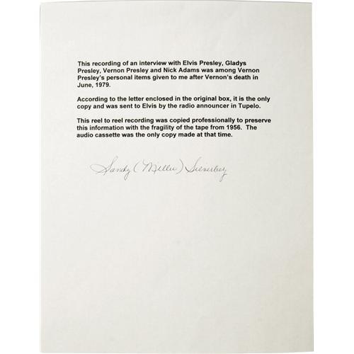 <B>Interview Recording of Elvis Presley and His Parents.</B></I> A reel-to-reel tape recording of a 1956 radio interview featuring Elvis Presley, his parents Vernon and Gladys, and actor and friend Nick Adams, recorded at WELO in Tupelo, Mississippi. The reel was sent to Elvis, who later gave it to Vernon and with whom it remained until passed on to a family friend after his death. The tape was professionally transferred to the included cassette to preserve it, and this are the only known copies in existence. Also included are two letters dated November 30, 1960, and January 11, 1961, sent to Elvis by the station in regards to the tape. In overall Very Fine condition. <I>From the Sandy Miller Collection</B></I>.<BR><BR><b>Shipping:</b> Flat Material, Small (<a target="_blank" href="http://www.heritageauctions.com/common/shipping.php">view shipping information</a>)