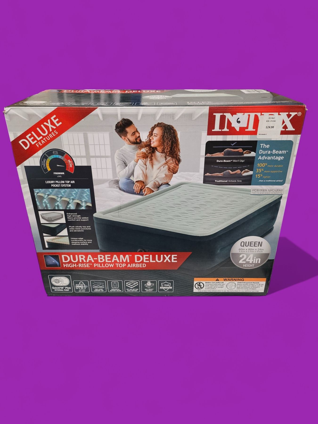 Intex Dura-beam Deluxe high rise pillowtop mattress. Deluxe features include air lock, enhanced strength, plush velvet, and more! Queen Size, 24" tall