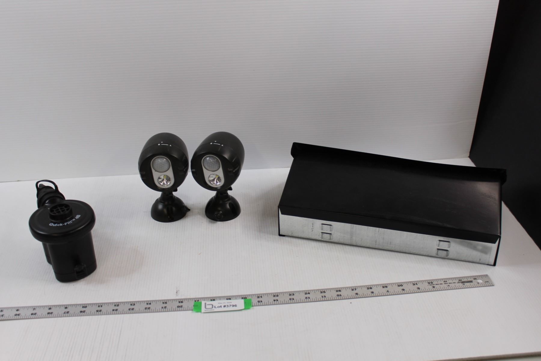 Intex Quick Fill Battery Operated Air Pump (Corroded Terminal, Untested), (2) Netbright MR. Beams Battery Operated Lights (Untested) & Mail Box