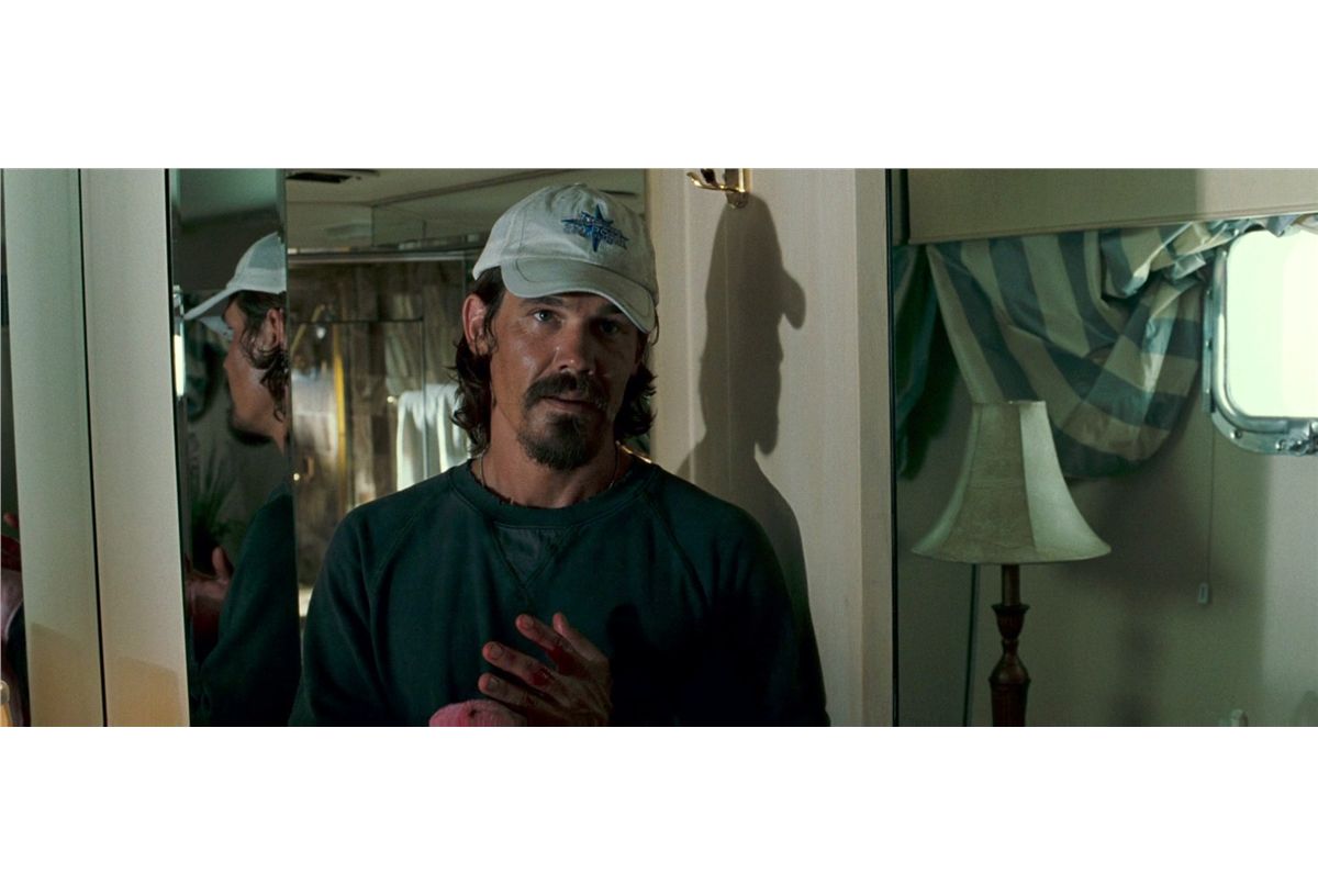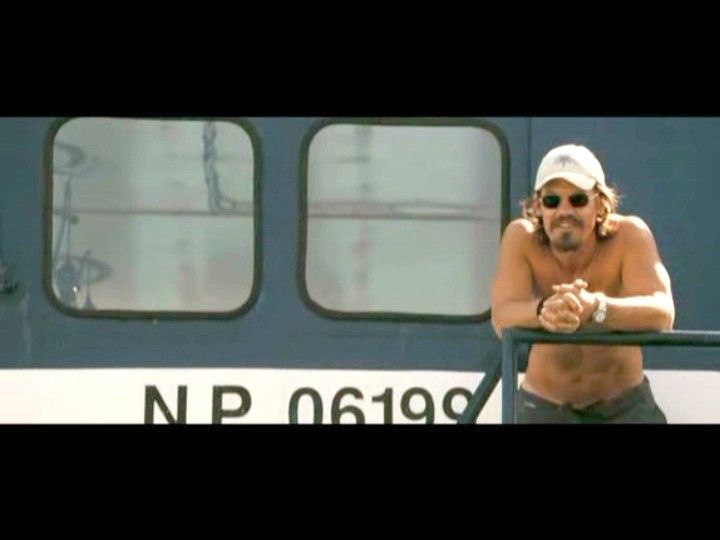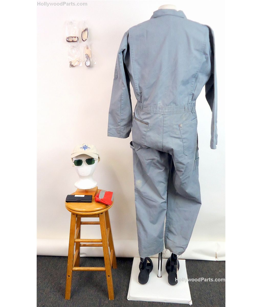 Hero costume worn by Josh Brolin as Bates in Into the Blue. Costume includes grey full length jumper, white mesh cap, Oliver Peoples Sunglasses, prop empty cocaine wrapper, bead bracelets, ball chain necklace, and silver Rolex watch replica.