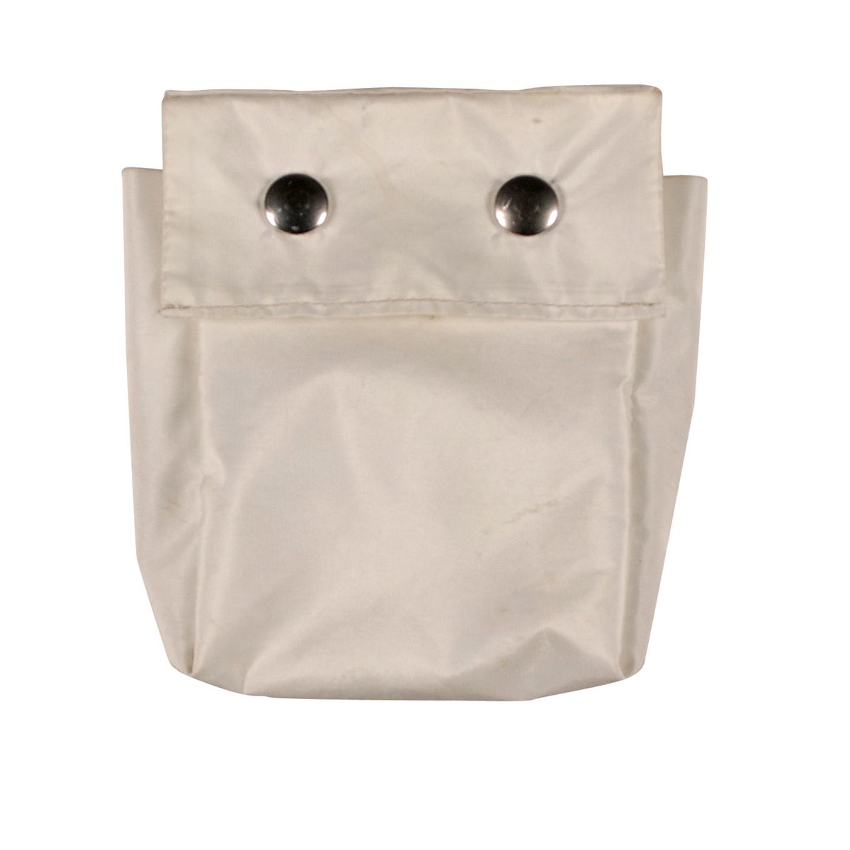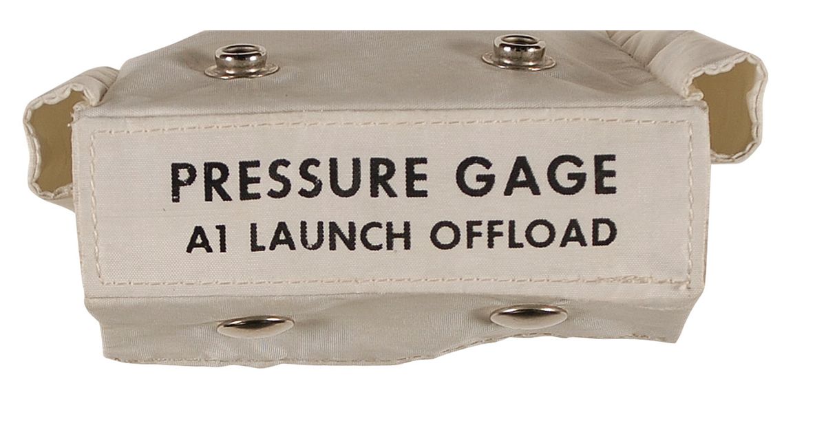 Intra-Vehicle Pressure Gauge Cap for an Apollo A7-L spacesuit. Neoprene rubber cover measures 2.25? in diameter, and is connected by a nylon cord to a Beta cloth bag. Top of bag is labeled “Pressure Gage A1 Launch Offload.” Cover has two snaps for closing, and back of bag has four snaps so that it could be attached to a spacesuit. Accompanied by two North American Rockwell Parts Control tags, with information filled out in a technician’s hand, and one Parts Status and Identification Tag. In fine condition. An important part as it was used to protect the pressure gauge while the suit was inside the space craft.