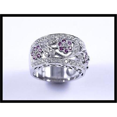 Intricate floral design ring with 18 round cut rubies that weigh approximately 0.35 carats and 53 full cut diamonds that weigh approximately 0.53 carats set in 14K white gold. The ring measures 11.9 millimeters 90.47 inches) wide.