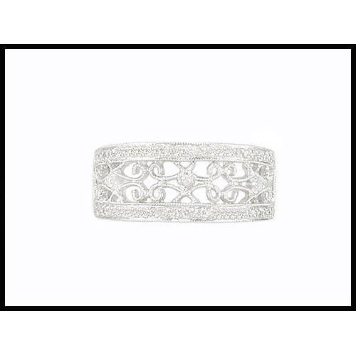 Intricate ring with 49 diamonds that weigh 0.25 carats set in 18K white gold. The design portion of the size 7-1/4 ring measures 9 millimeters (3/8 inches) high x 21 millimeters (13/16 inches) wide. The ring weighs 7.00 grams total weight.