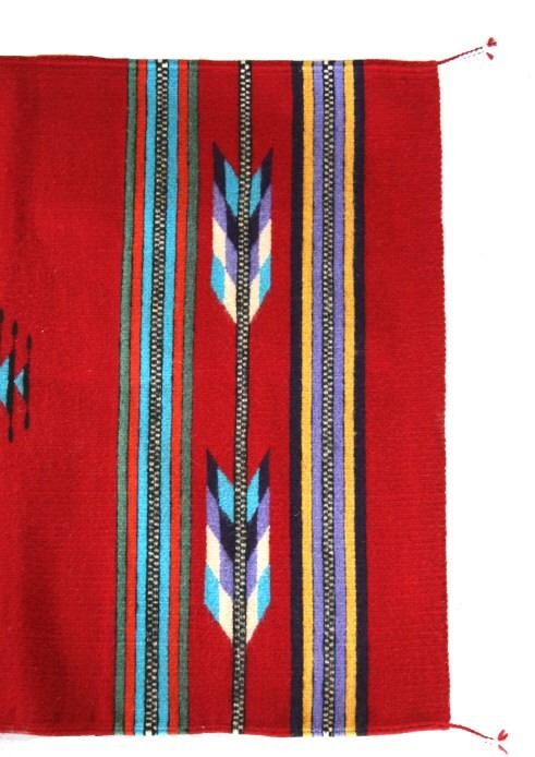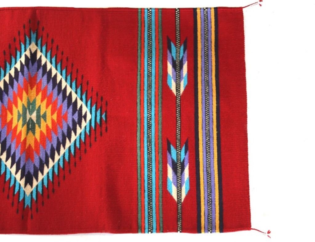 This is an excellent handwoven flat weave rug by master weaver Jorge Gutierrez using 100% soft fine handspun yarns in a beautiful Intricate Diamond pattern. The rug was handwoven with a tight weave using 100% handspun wool yarns that offers natural variegation and durability with color fast aniline dyes. Tight handwoven weave displayed with bright rich tones in the fine Intricate Diamond pattern in the time-honored Zapotec multi-generational craft by a master weaver, Jorge Gutierrez. The rug shows a phenomenal Navajo like Crystal Eye Dazzler pattern with modern detail showing a rich red background, with large diamond pattern at the center having a rainbow of colors and finished by the bands of color on each end. The piece is brand new in pristine condition with fine tight weave. The rug measures 2’ 6” by 5’ (2 foot 6 inches by 5 foot). This is a brand-new rug.