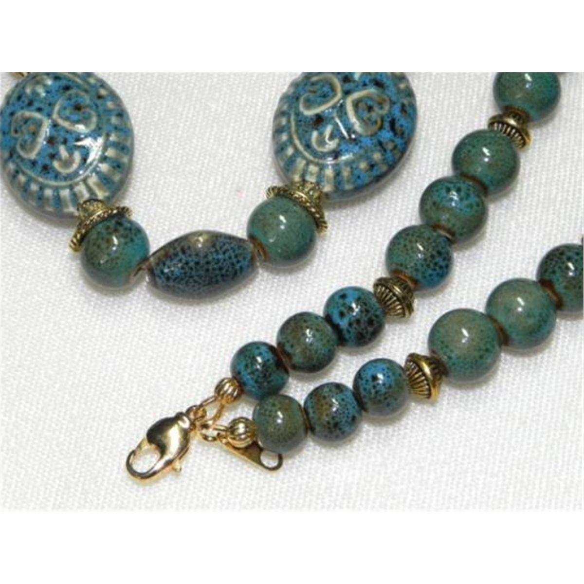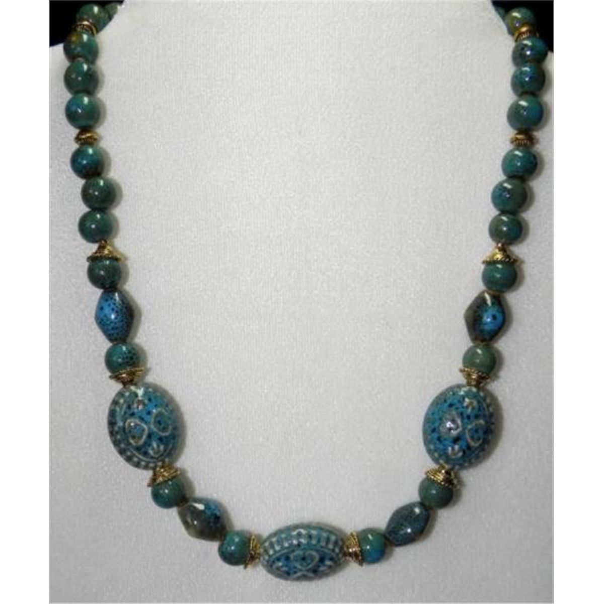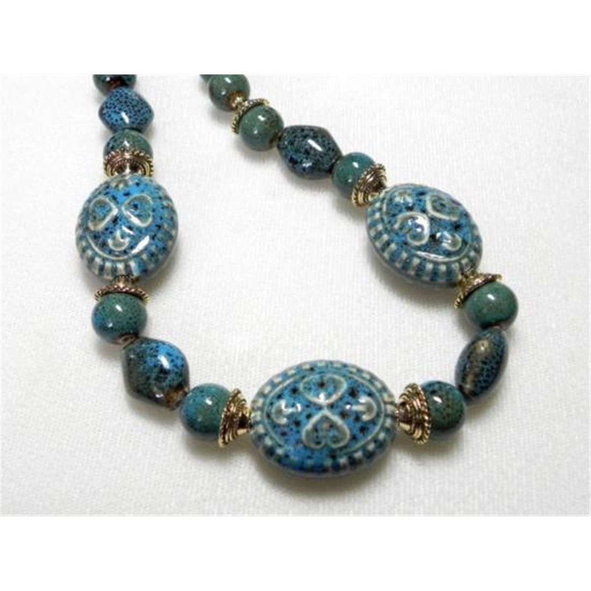 Intricate Green and Blue Detailed Ceramic Bead Necklace. The necklace measures apprx 20 in length. Rich, earthy blue-green ceramic beads are mixed with detailed goldtone metal beads and gold plated pewter caps to create a stunning necklace.