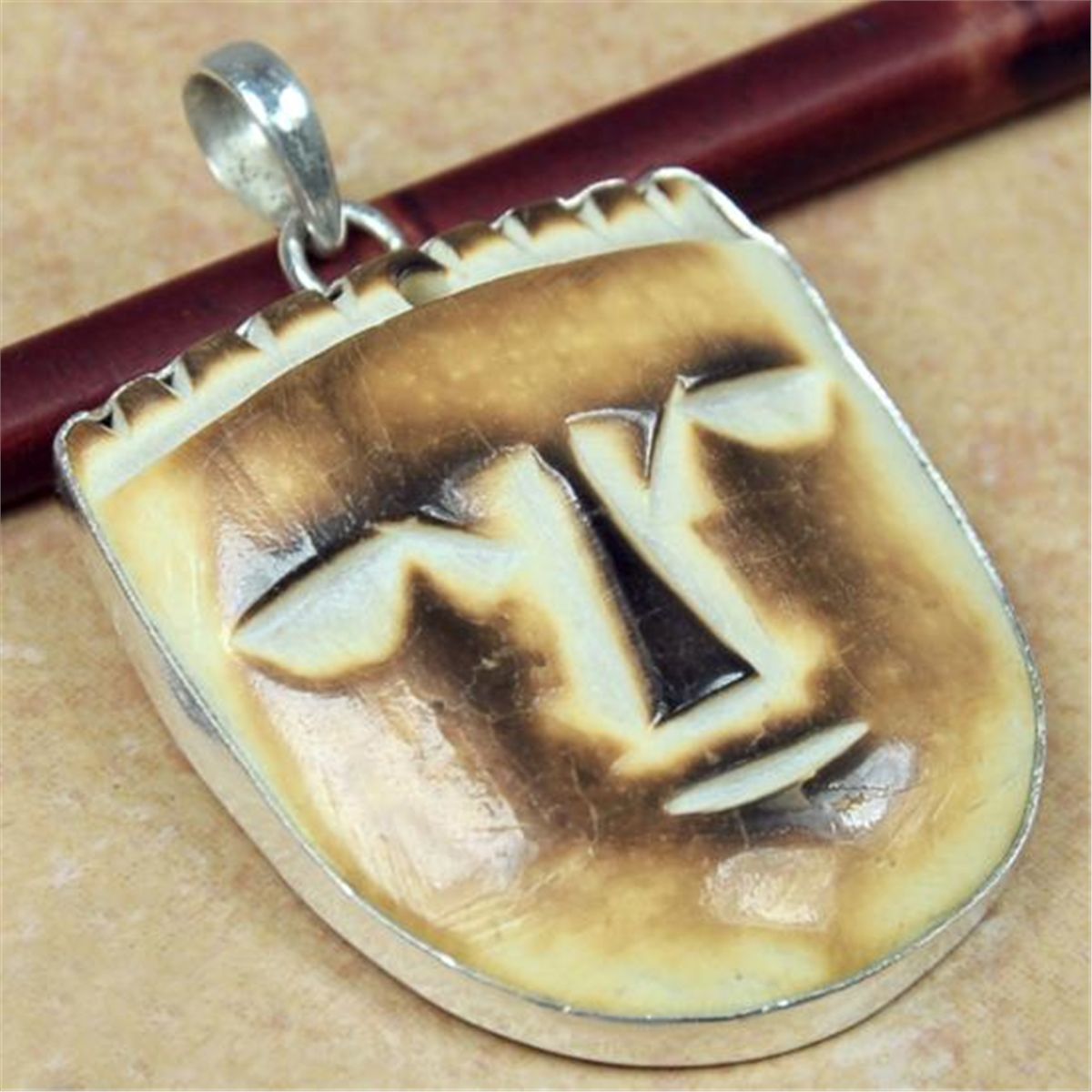Intricate Hand Carved AFRICAN BONE and STERLING SILVER PENDANT, measures 2 in long, MWF1839