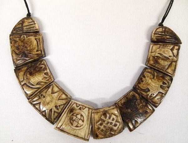 Intricately Carved Bone Necklace on String. This Item has 10 carved pieces and measures approx. 20'' Long.