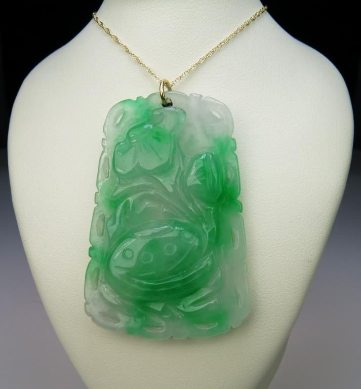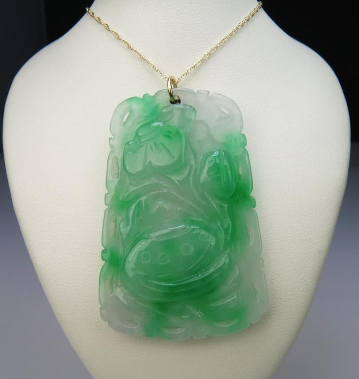 Intricately Carved White and Bright Green Burmese Jade Pendant carved in floral motif this high quality jade has strong translucency and is highly polished. Piece measures 2 x 1.25 inches, artisan signed on back of pendant with 14 karat yellowgold chain. Retail $700-$900 Estimate $500-$600.