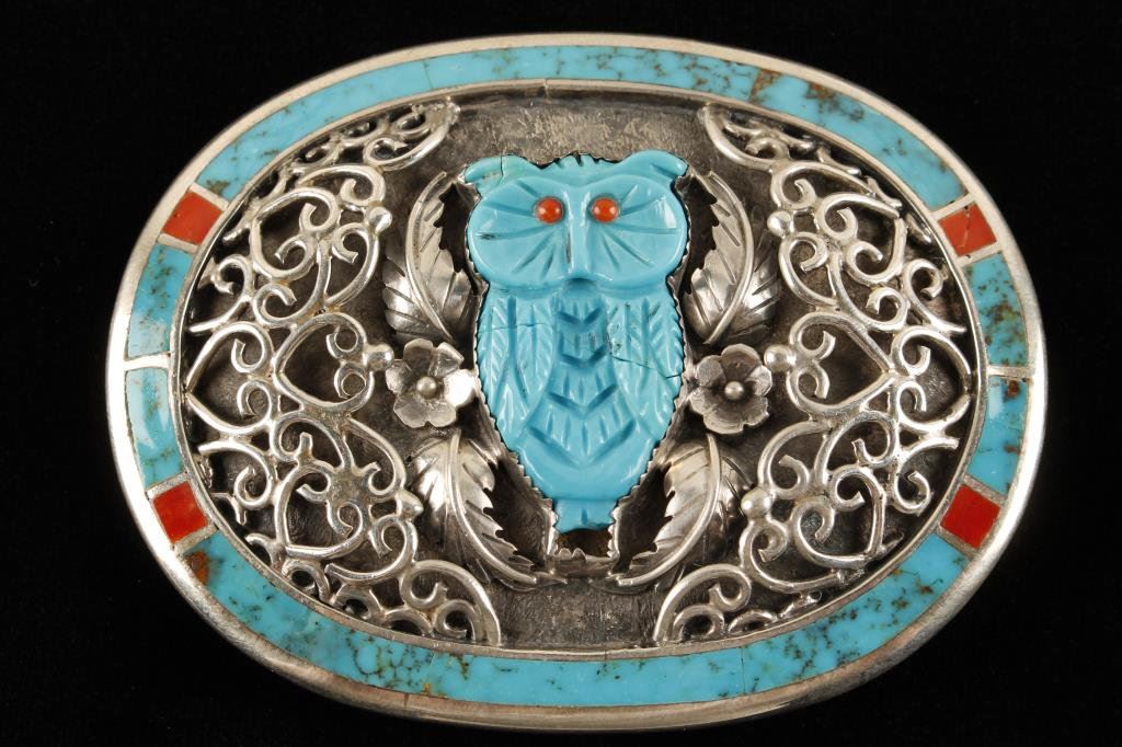 Intricately crafted Belt Buckle in sterling silver set with a turquoise owl in the center signed by artist. Est.:$500-750