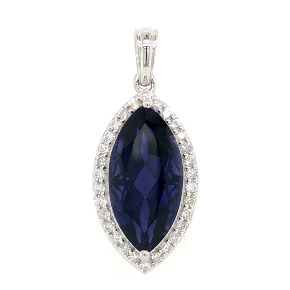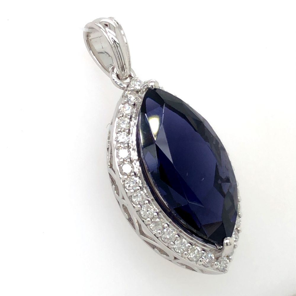 Genuine Iolite and Earth-Mined Diamond Pendant. Iolite is one of the hot, trending gemstones that is currently sweeping the jewelry industry. This 5.81 carat marquise-cut, midnight blue iolite has scintillating flashes of reds and violets. This enchanting iolite is prong set in a 14 karat white gold navette-shaped mounting with .42 carats of round, brilliant-cut, H-I color, I1 clarity diamonds in the framing halo that is raised upon an ornate side gallery. The pendant measures approximately 1.25& quot; x 1/2& quot; and hangs from an attached solid bail that allows for a chain up to approximately 3 mm. This pendant is certified and appraised for $13,550.00 estimated retail replacement value.