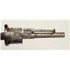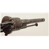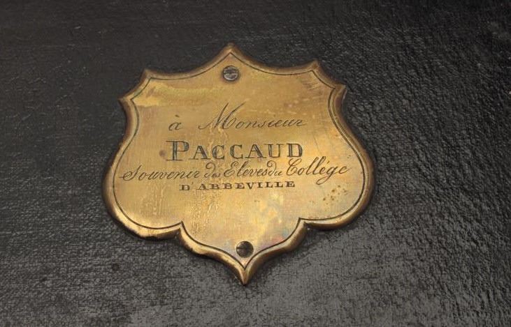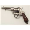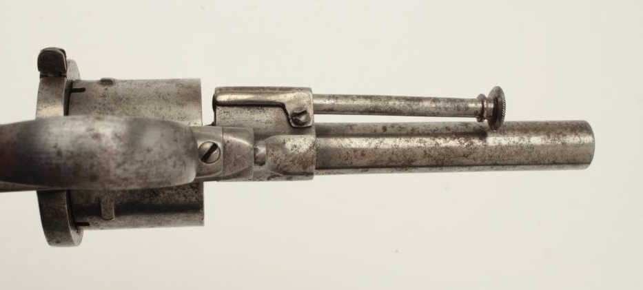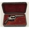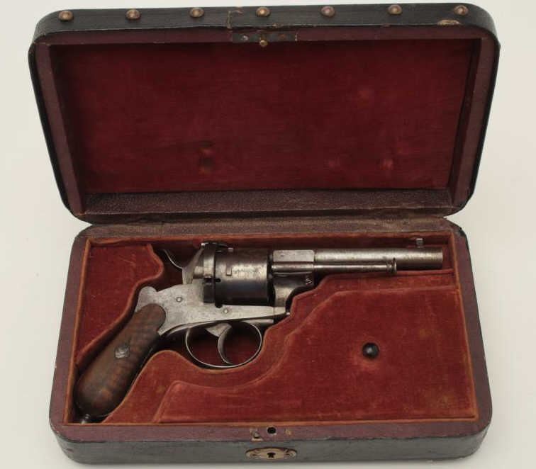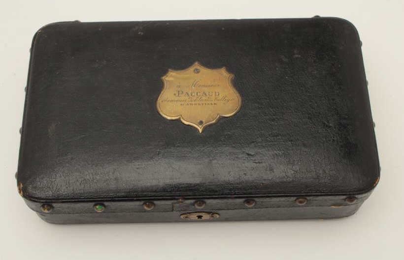 Intriguing cased pinfire pistol with plaque on the lid of the box inscribed in period script and block letters, “A Monsieur Paccaud, Souvenier des Elevesdu College, D’ Arbeuille”. The revolver is a medium sizedouble action in 9mm pinfire six shot with fixed trigger guard and bag shaped grip. Measures approximately 9” overall with a 4” barrel. Belgium proofs and no other markings. Light rust and slight erosion on French gray on bright metal polished finish. Good condition with minor beginning pitting and normal aging. Tight action and crisp bore. Deluxe form fitted French case in good to very good condition with slightly faded andnicely aged velvet lining. 1 large compartment with original cover. The case is leather covered with brass tacks and also very good plus with minor aging and slight imperfections. Would be interesting andpossibly rewarding to research inscription. (Antique) Est.: $800-$1600