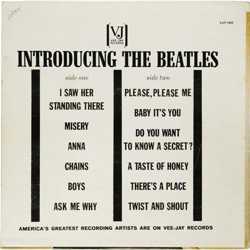 <B>"Introducing the Beatles" Stereo Title Back LP Vee-Jay 1062 (1964).</B></I> The selections had been recorded as early as two years prior, and Vee-Jay had already lost out to Capitol for the rights to record new music. Not as big as Capitol's newly-recorded "Meet The Beatles", which really propelled Beatlemania in the US, "Introducing" debuted one week after "Meet the Beatles" and had to be content with peaking at #2, holding that position for nine weeks and charting for 49 weeks in all. "Stereophonic" is shown at the top of the front cover; the Vee-Jay label is black with a color band, "VJ" in brackets. "Please Please Me" and "Ask Me Why" are included; and it's the "title back" version. There is writing in ink and some minor staining present on the back cover, but the disc is close to perfect. Condition: VG-EX 6/ NM 8. <I>From the GRT Collection</B></I>.