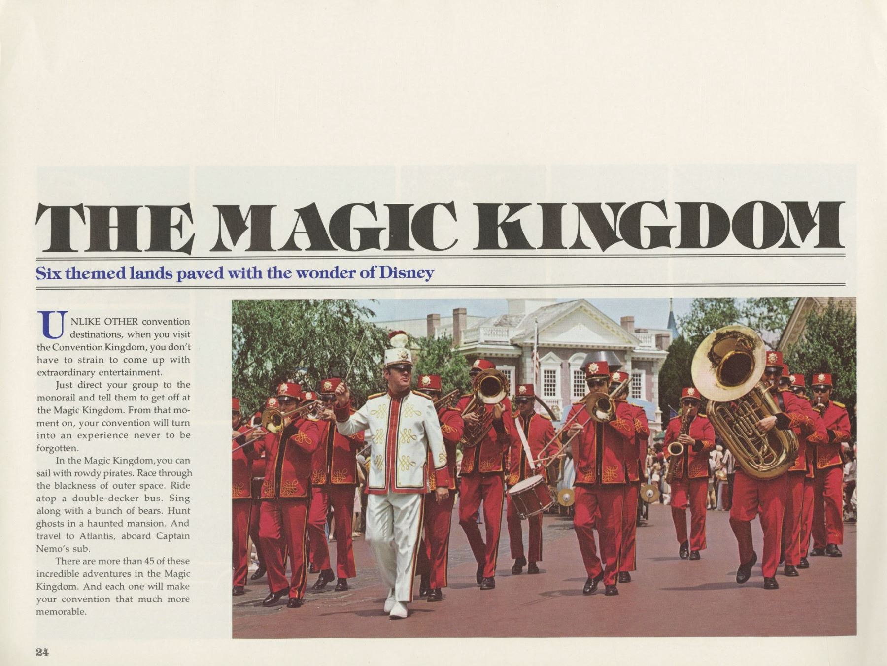 (Contemporary Resort, 1977) A 30-page booklet created to promote the convention and meeting facilities available at Walt Disney World. This booklet promotes the Contemporary Resort and Polynesian Village, as well as the various services and activities around Walt Disney World. Full of wonderful color photos and early park information, this brochure measures 9"x12" and is in very good condition with minor surface wear from use.