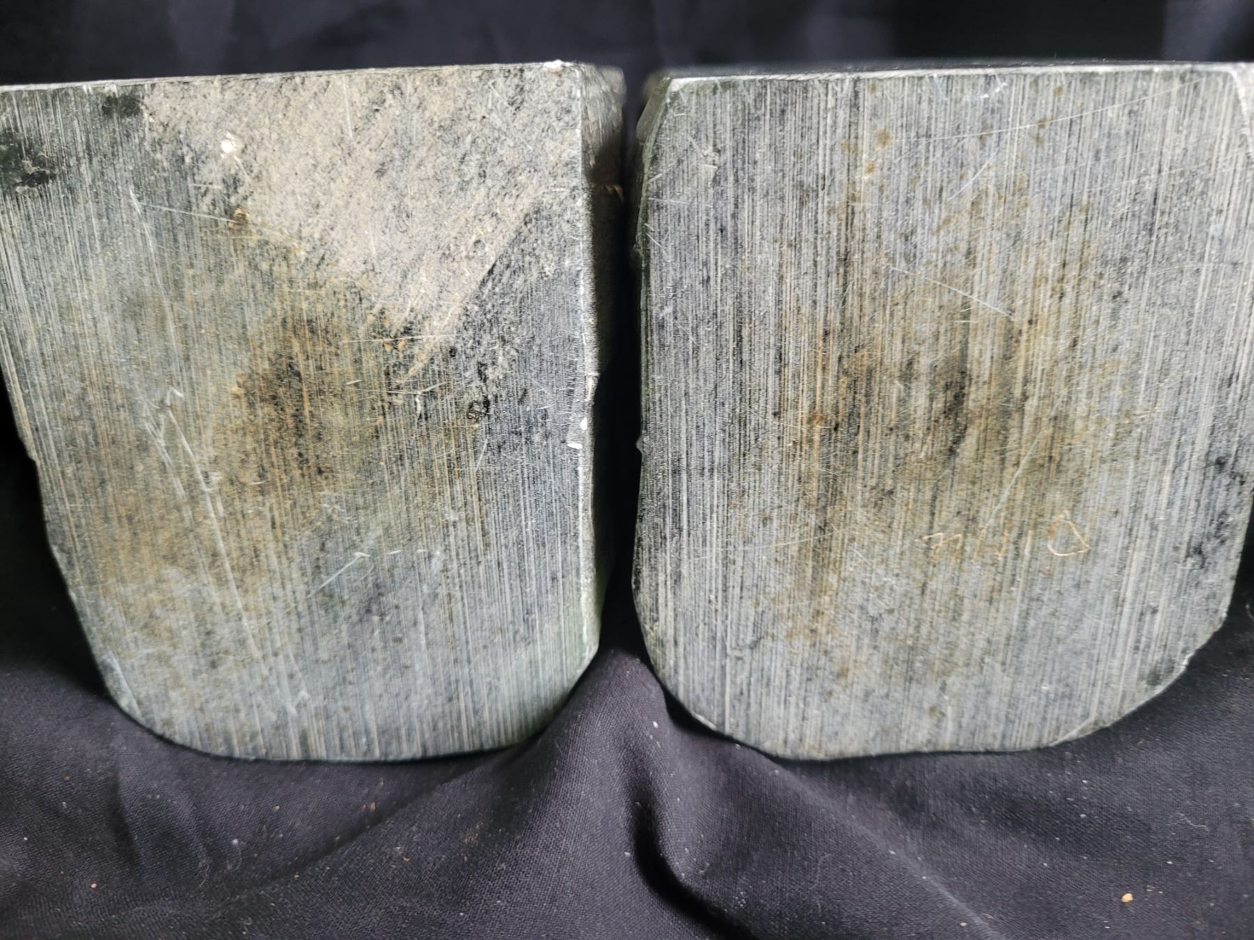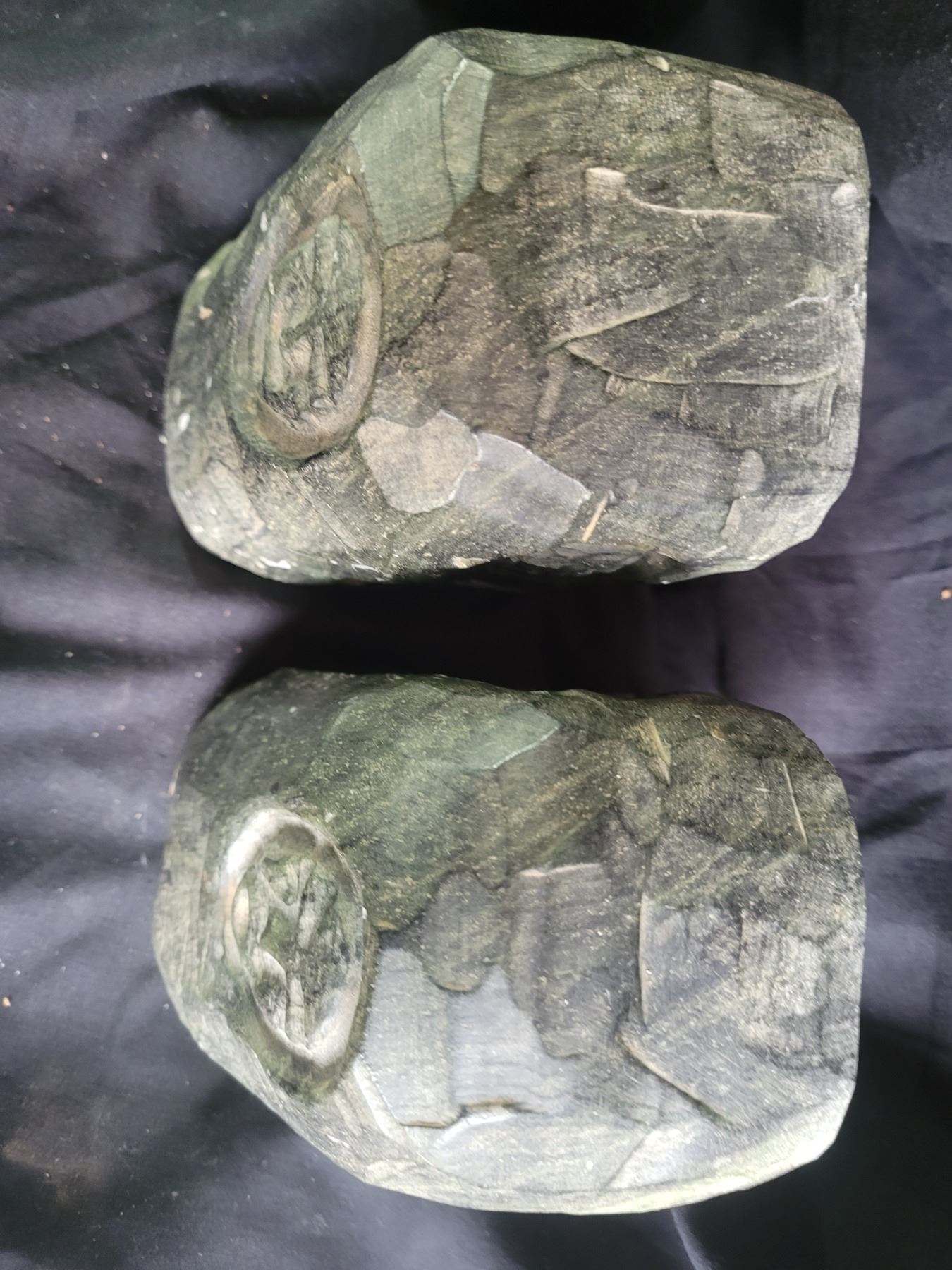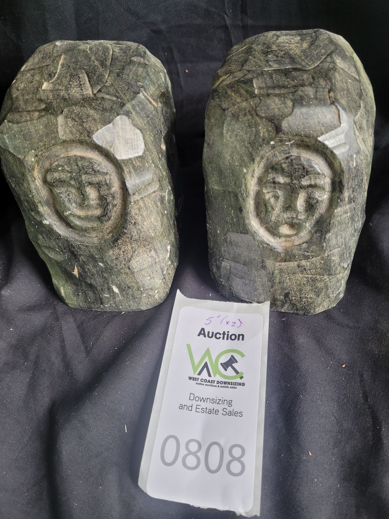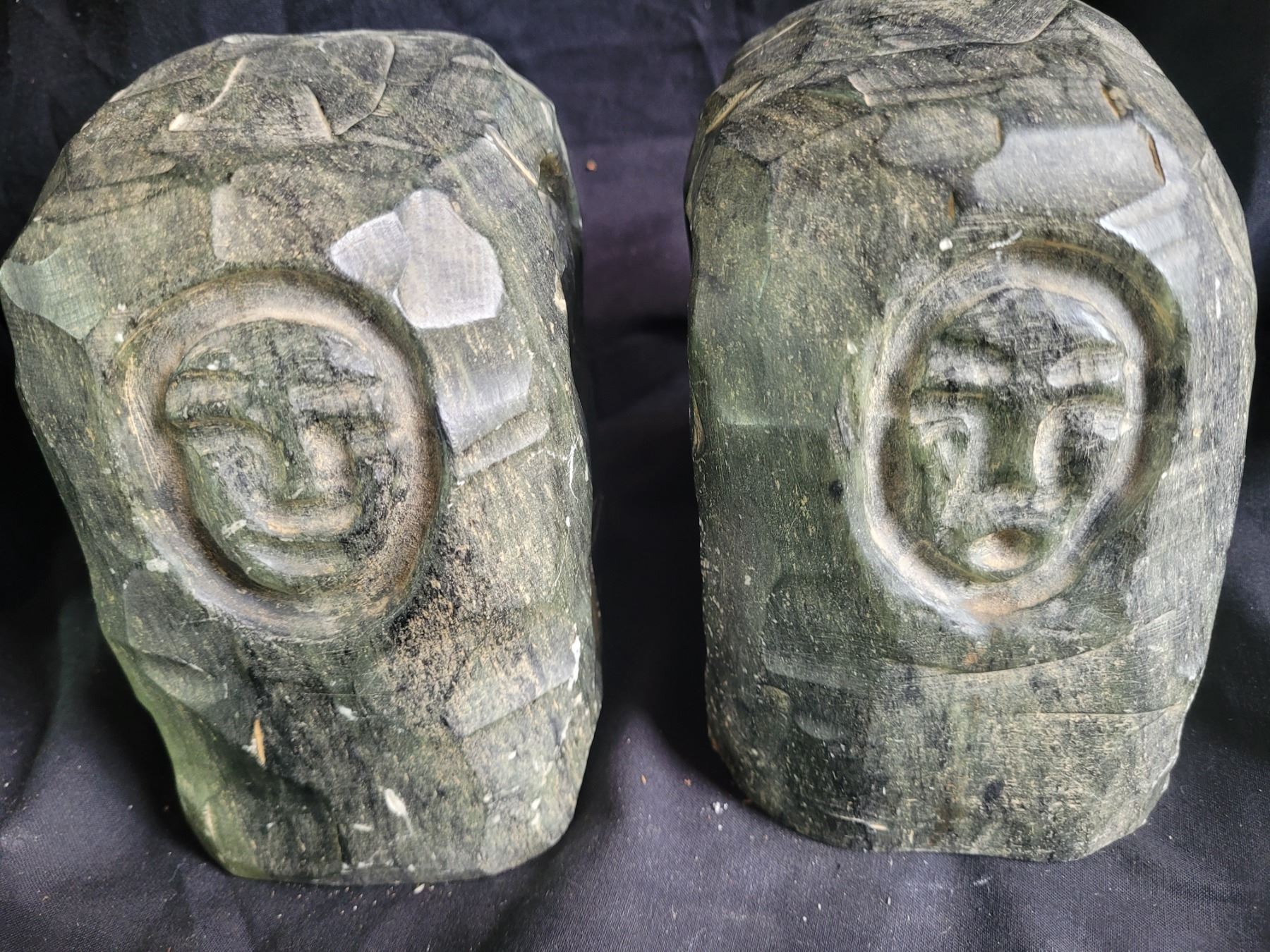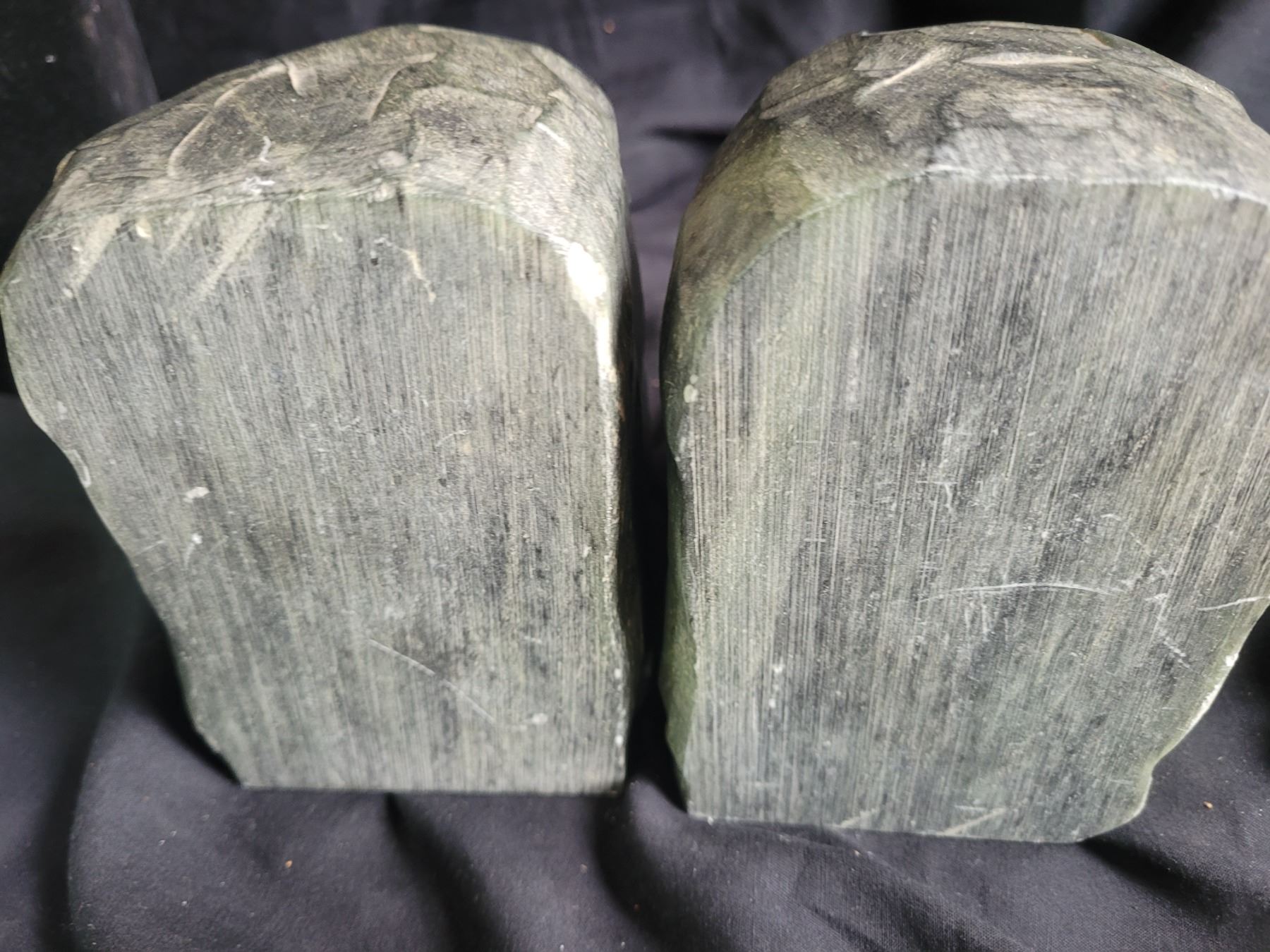 A pair of carved soap stone bookends, artist name scratched on bottom, see image. Pickup at 9 am