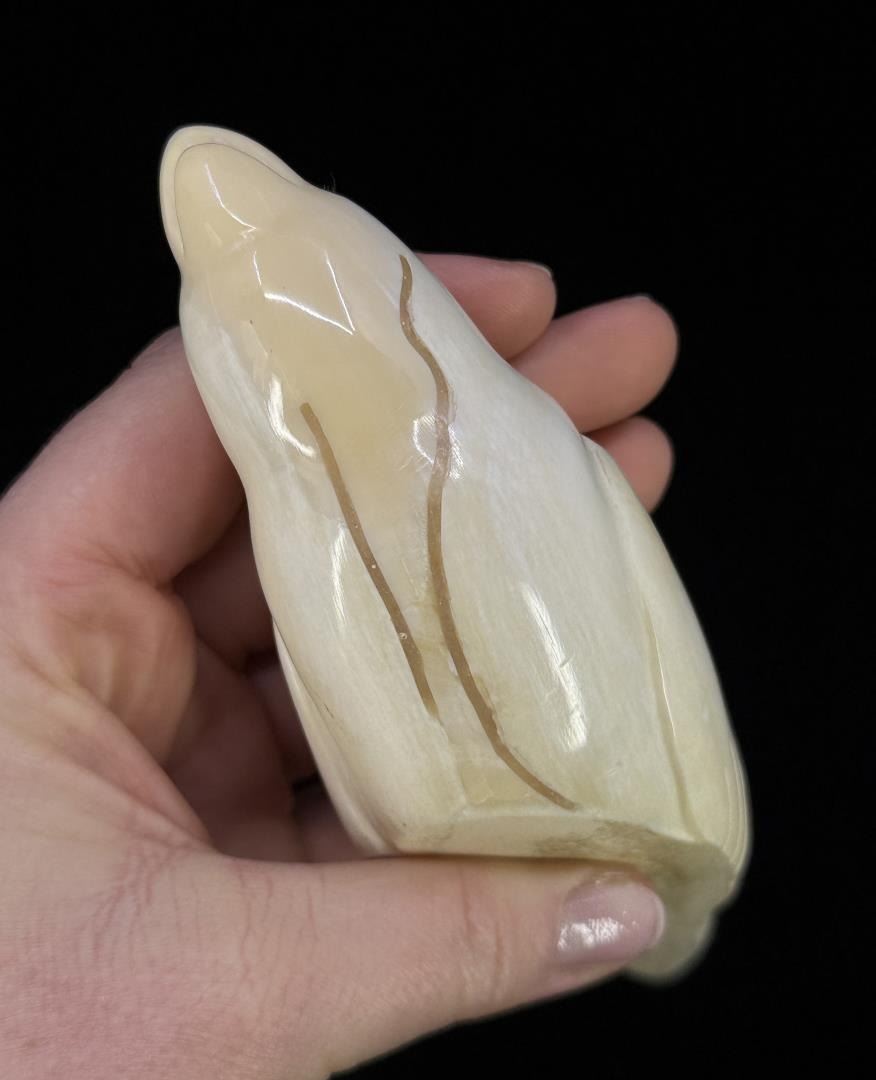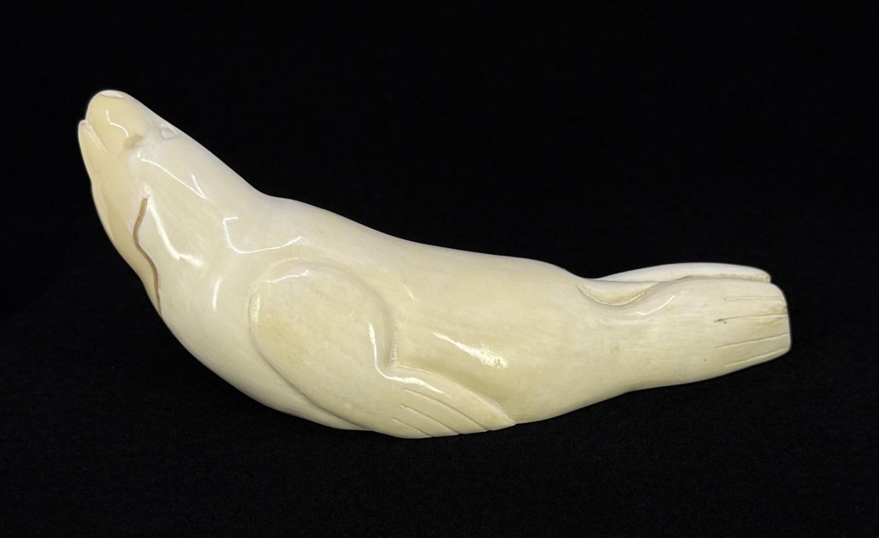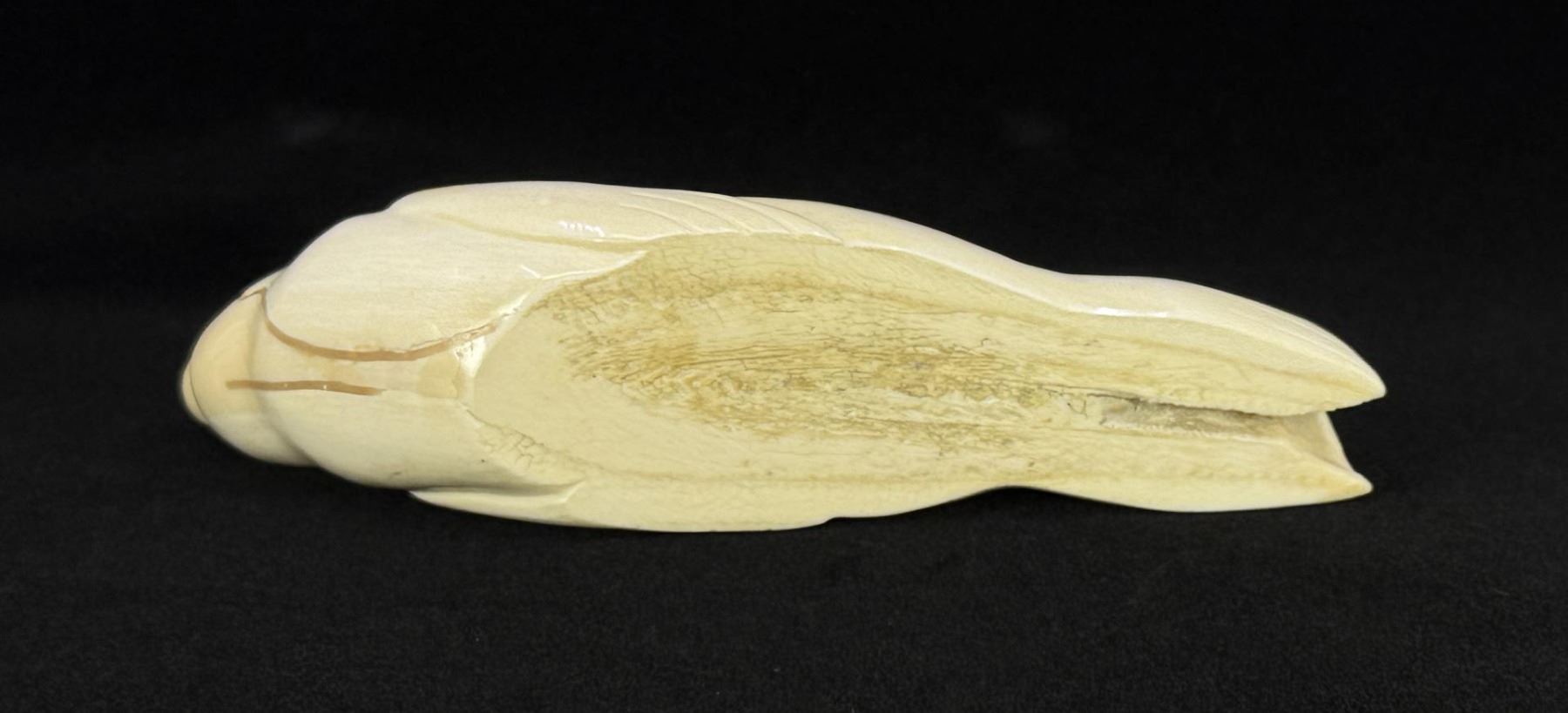 6 1/2" by 2 5/8" by 1 3/4". Carved Walrus Ivory. Native made prior to 1972. This item cannot be shipped to Oregon, California, Hawaii, New York, New Jersey, Internationally, or any other state that prohibits. Provenance: Heard Museum, Arizona; Private Collection, New York.