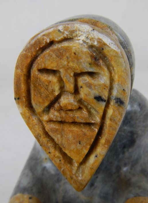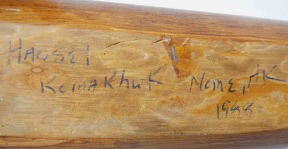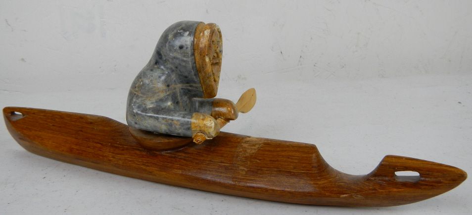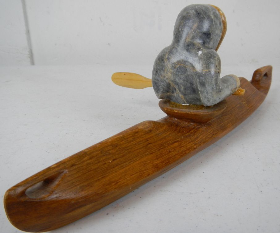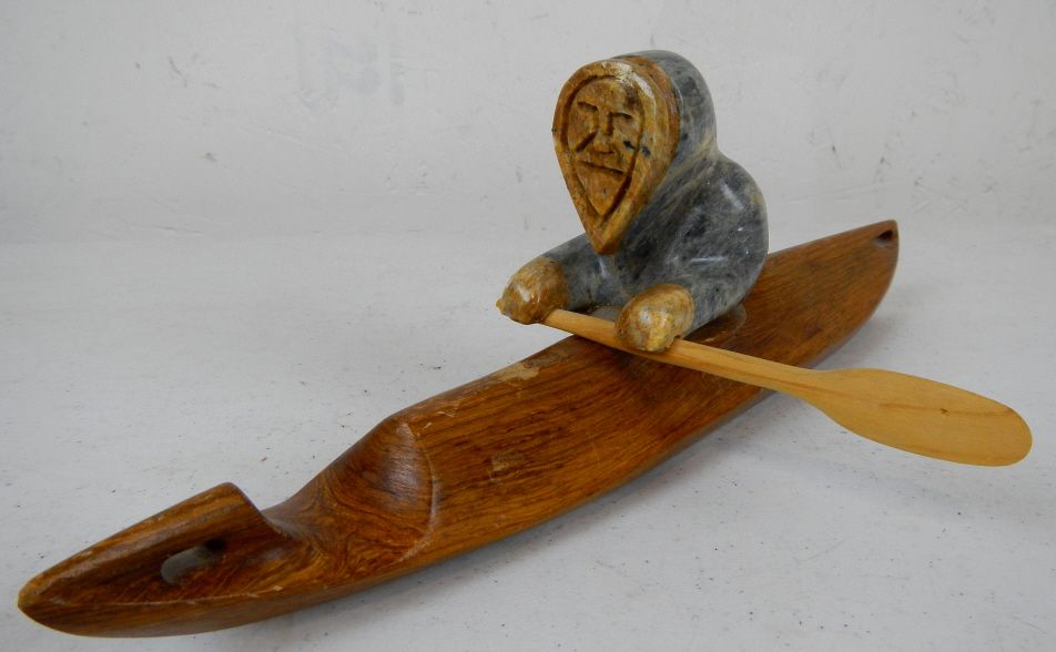 Inuit Eskimo Kayak Sculpture - This is an original Sculpture hand carved by the Eskimo Native Americans. This is signed, "Hansei Komakhuk Nome, Ak 1988" This has a chip around the head and the paddle is glued on. Measures 13" long by 4 1/8"