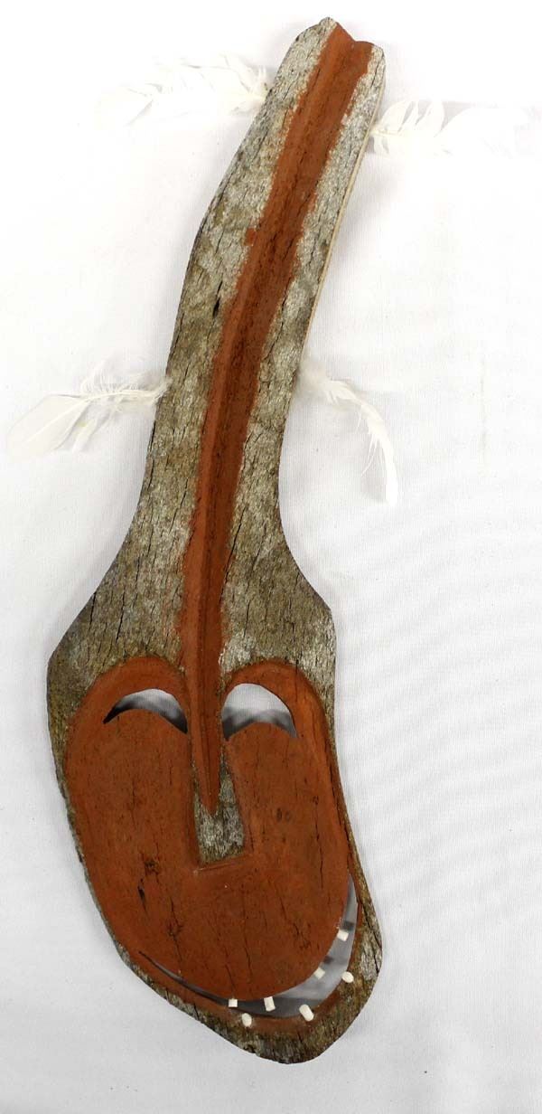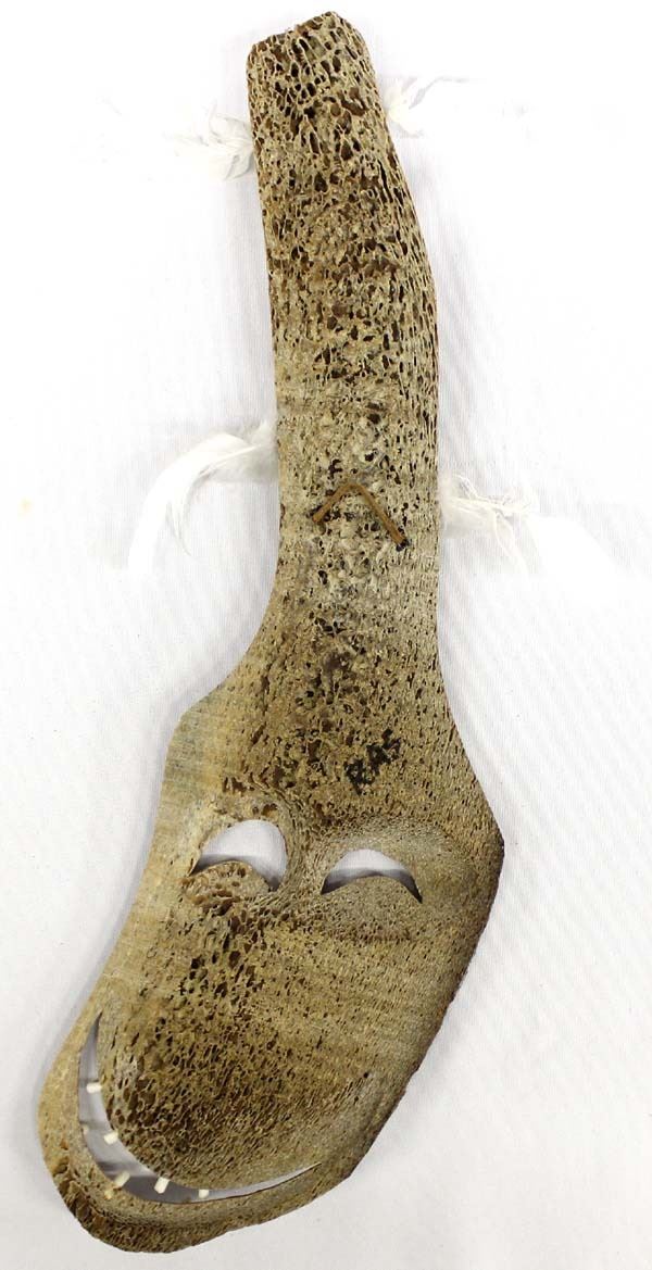 Inuit Eskimo Whale Bone Mask, measures 5'' x 17.5'' and is embellished with feathers