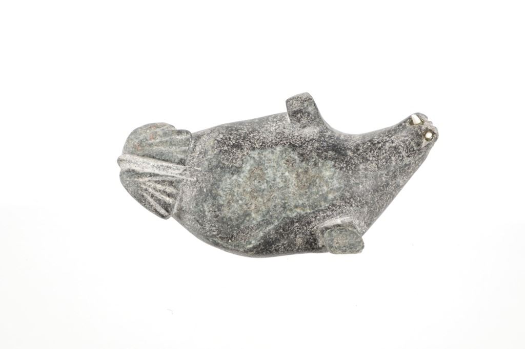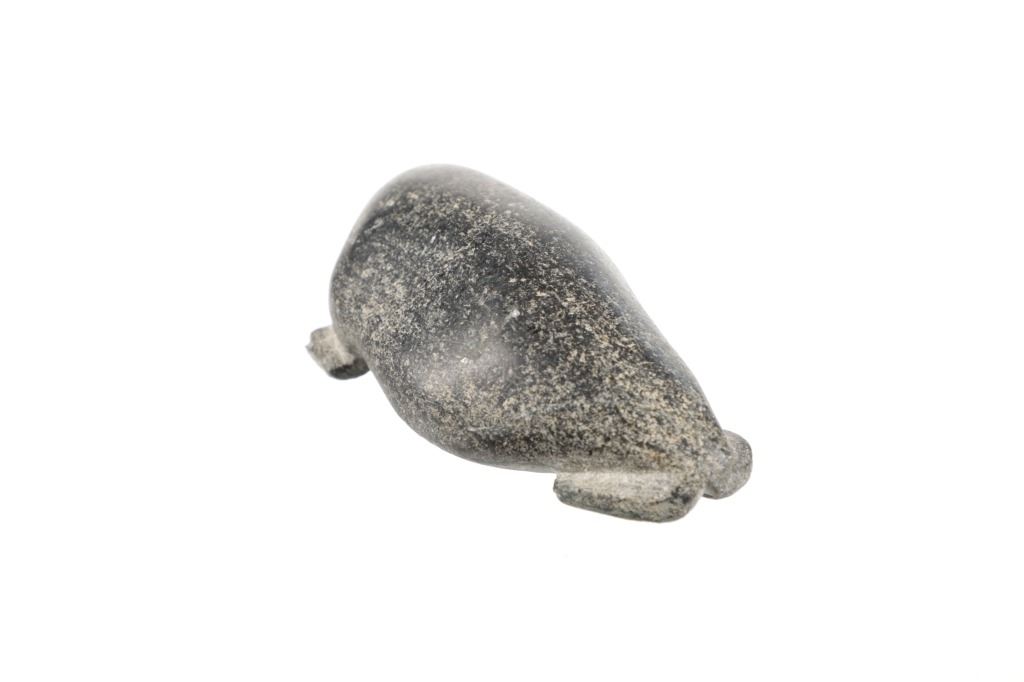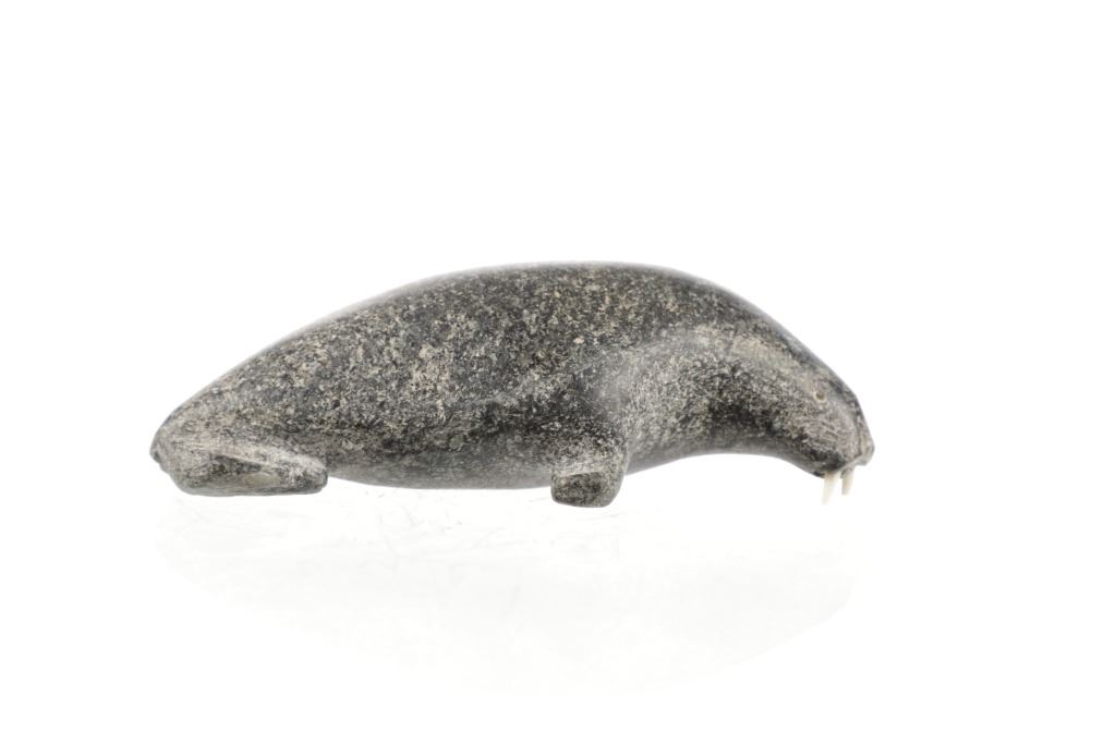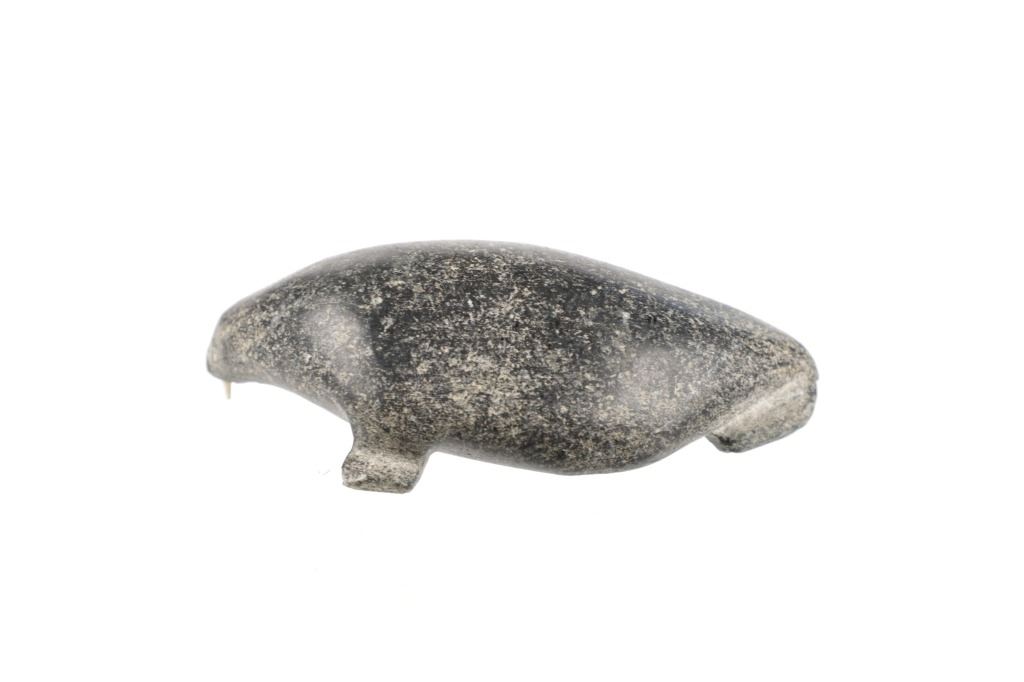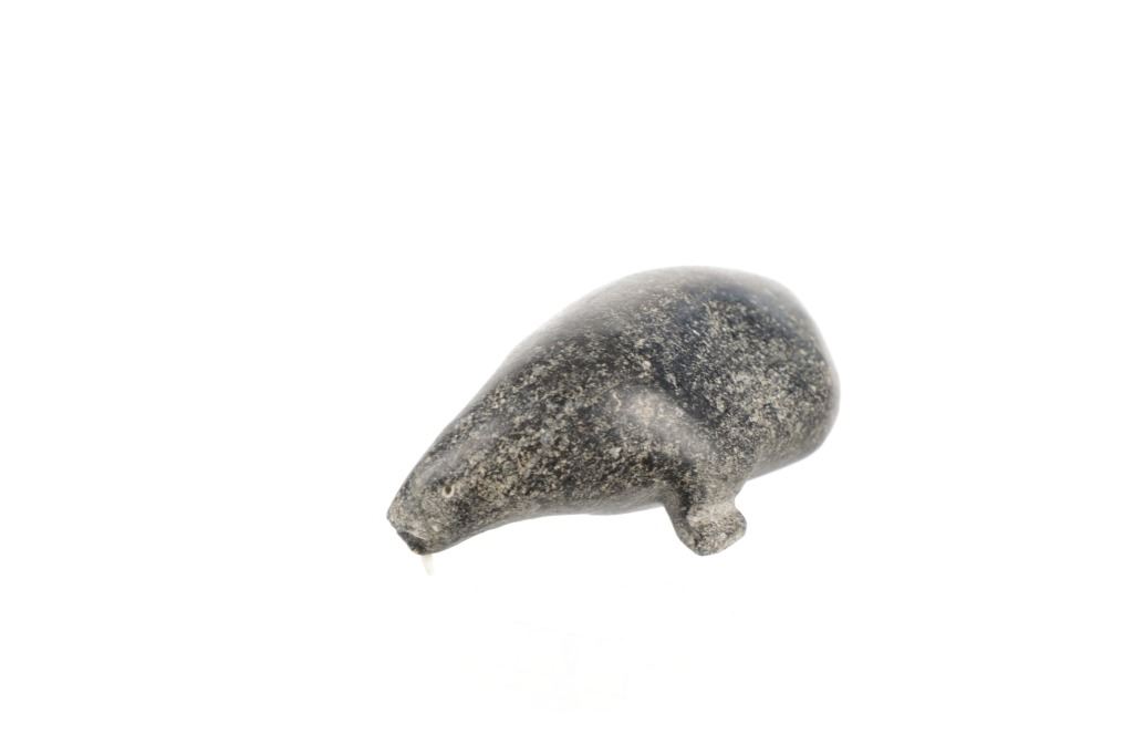 For your consideration is this early 20th century Inuit steatite walrus carving with bone tusks. This carving is in the shape of a walrus and shows various colors within the steatite carving such as beige, gray and black. It features two small tusks in its mouth made from carved bone. It shows good condition overall with slight wear present from its age and use over the years, but no major signs of damage is noted. It measures 5 1/2" L x 2 7/8" W x 1 3/4" H and weighs 1 pound.