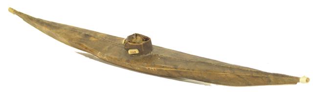 Late 1800s, Very rare stretched sealskin kayak with bone tips, accents, and keel runners. 2" x 21-1/2"