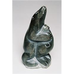 An amusing grey stone carving of a standing Polar Bear hugging a Seal, inscribed with the carver number on the underside.