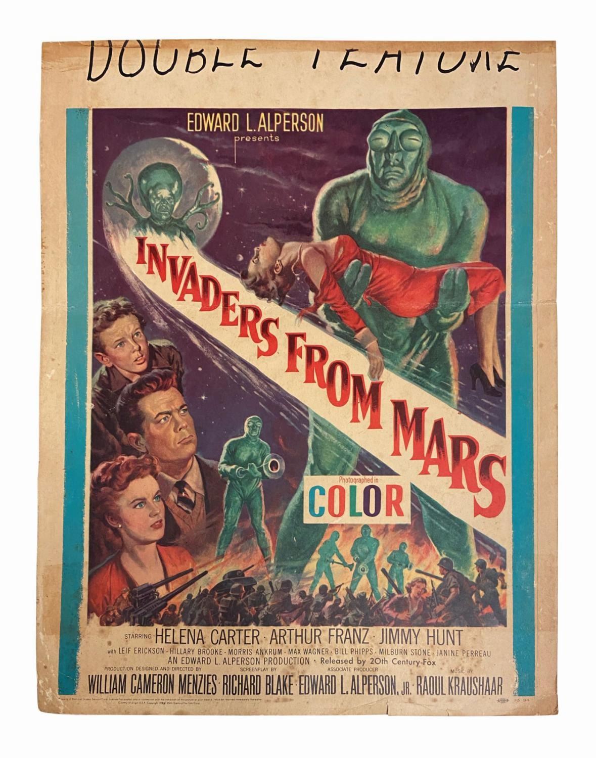 (TCF, 1953) An original U.S. window card poster for the alien body-swapping thriller, Invaders from Mars. Measuring 18"x14" (the playdate field has been trimmed), the poster is in fair condition with some discoloration throughout, a horizontal and vertical crease, block stains in the borders at either side of the bottom of the image, writing in the playdate field, and small amounts of paper loss and tears.