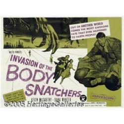 <B>Invasion of the Body Snatchers (Allied Artists, 1956)</B></I> British Quad (40" X 30"). Don Siegel's low budget sci-fi masterpiece was based on a novel by Jack Finney and told the story of alien space spores intent upon taking control of the human race, one body at a time, by transforming into exact physical likenesses of their victims and then destroying the bodies. Its original working title was "They Came from Another World." A prologue, new ending, and voice-over narration were added shortly after the film's initial release, to help moviegoers keep up with its non-linear plotline. "Body Snatchers" is often thought of as a Hollywood metaphor for the McCarthy hysteria that gripped America in the 50s, an unrelenting message that preached the possibility that the enemy is among us. There is fold line wear, small amounts of paper loss at the crossfolds, pinholes, creases, and chips and small tears around the borders. The poster has been professionally restored, minimizing these defects. Fine+.