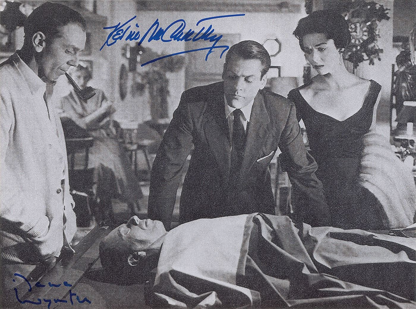 Two items: a glossy 13.5 x 10 photo of a scene from the classic 1956 sci-fi horror film Invasion of the Body Snatchers, signed in blue felt tip, "Kevin McCarthy" and "Dana Wynter"; and an original color Allied Artists lobby card for the same film, 14 x 11, signed in black felt tip, "From: Kevin McCarthy." In overall very good to fine condition, with grainy image quality to the photo, and old tape stains to the edges of the lobby card.