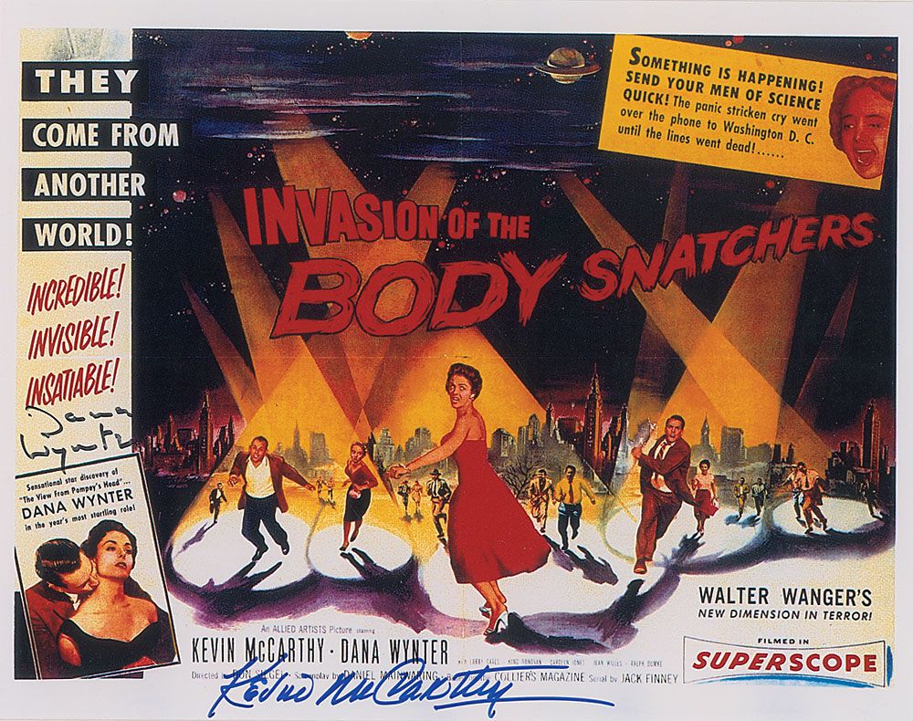 Color glossy 12.5 x 10 photo of a lobby card for the film, signed in blue felt tip by Kevin McCarthy and in black felt tip by Dana Wynter. In very fine condition.