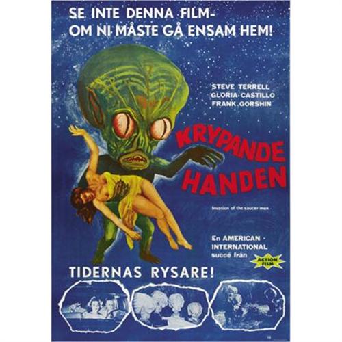 <B>Invasion of the Saucer-Men (American International, 1957).</B></I> Swedish One Sheet (27.5" X 39.5"). Paul Blaisdell's unforgettable alien monster designs highlight this science fiction film that has basically the same plot as "The Blob." Frank "Riddler" Gorshin has a supporting role. Light crimping on bottom edge. Rolled, Near Mint. <BR><BR><b>Shipping:</b> Rolled Material (<a target="_blank" href="http://www.heritageauctions.com/common/shipping.php">view shipping information</a>)