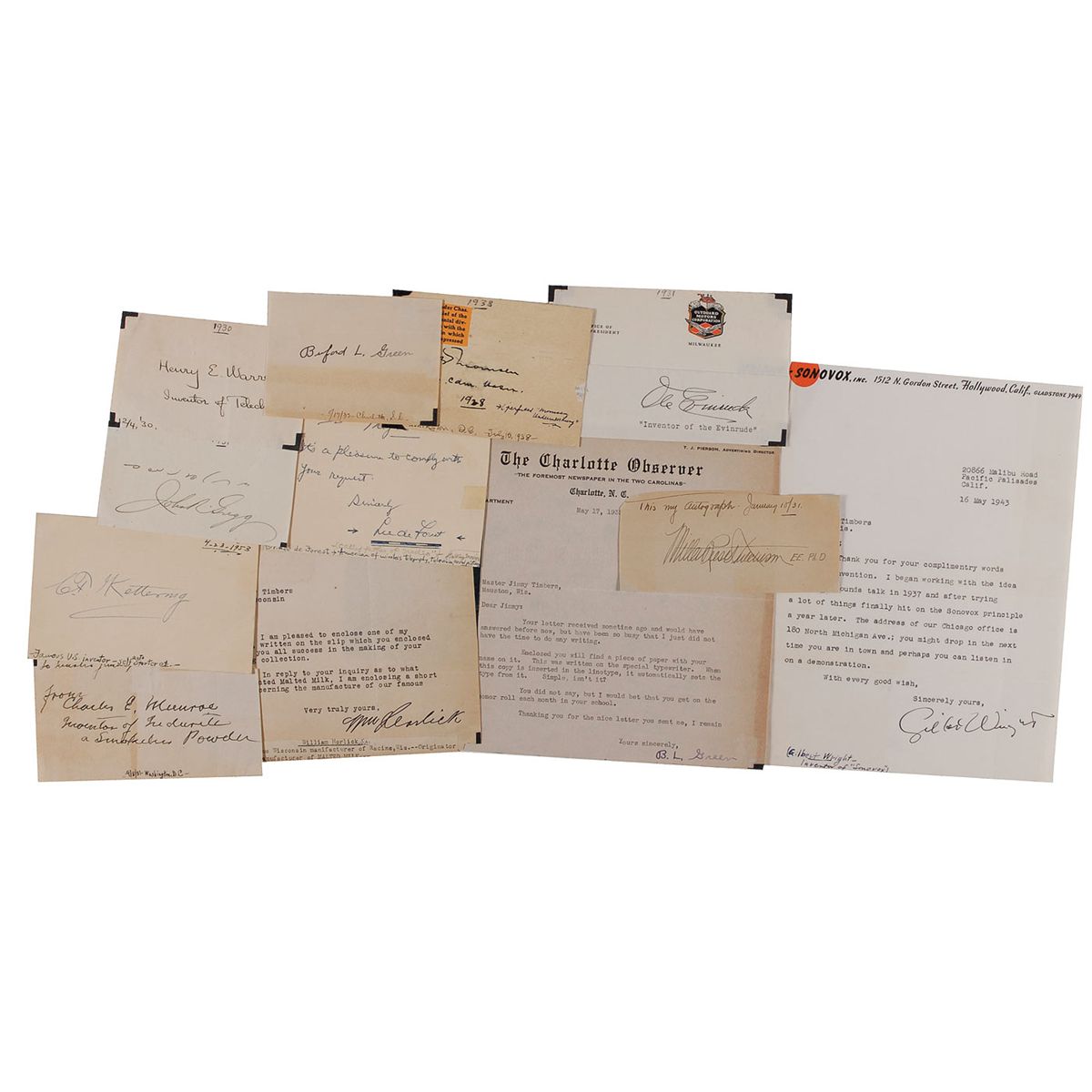 Collection of 12 items consisting of signatures and letters, each signed by a different inventor. Signers are: John Gregg, Miller Reese Hutchison, Lee De Forest, Henry Warren, Ole Evinrude, C. B. Momsen, Charles Monroe, C. F. Kettering, William Horlick, Buford L. Green (2), and Gilbert Wright. In very fine condition, with various scattered toning, trimmed edges, folds, and mounting remnants to some of the corners.