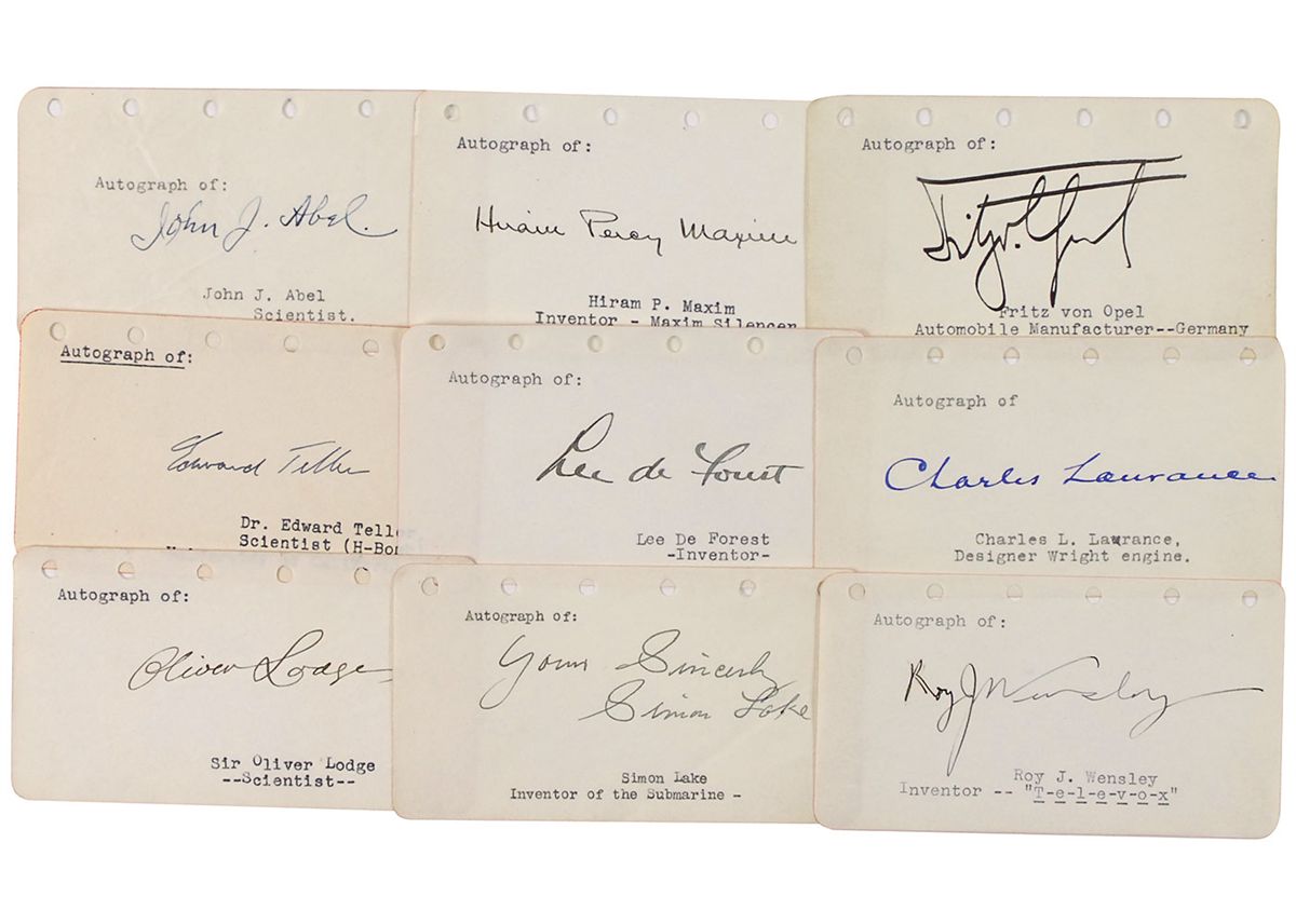 Collection of nine vintage ink signatures of influential inventors on individual off-white 4.5 x 2.5 pages. Signers are: Edward Teller, Fritz von Opel, Hiram P. Maxim, Oliver Lodge, Charles Lawrance, Roy J. Wensley, Simon Lake, Lee de Forest, and John J. Abel. In overall fine condition.