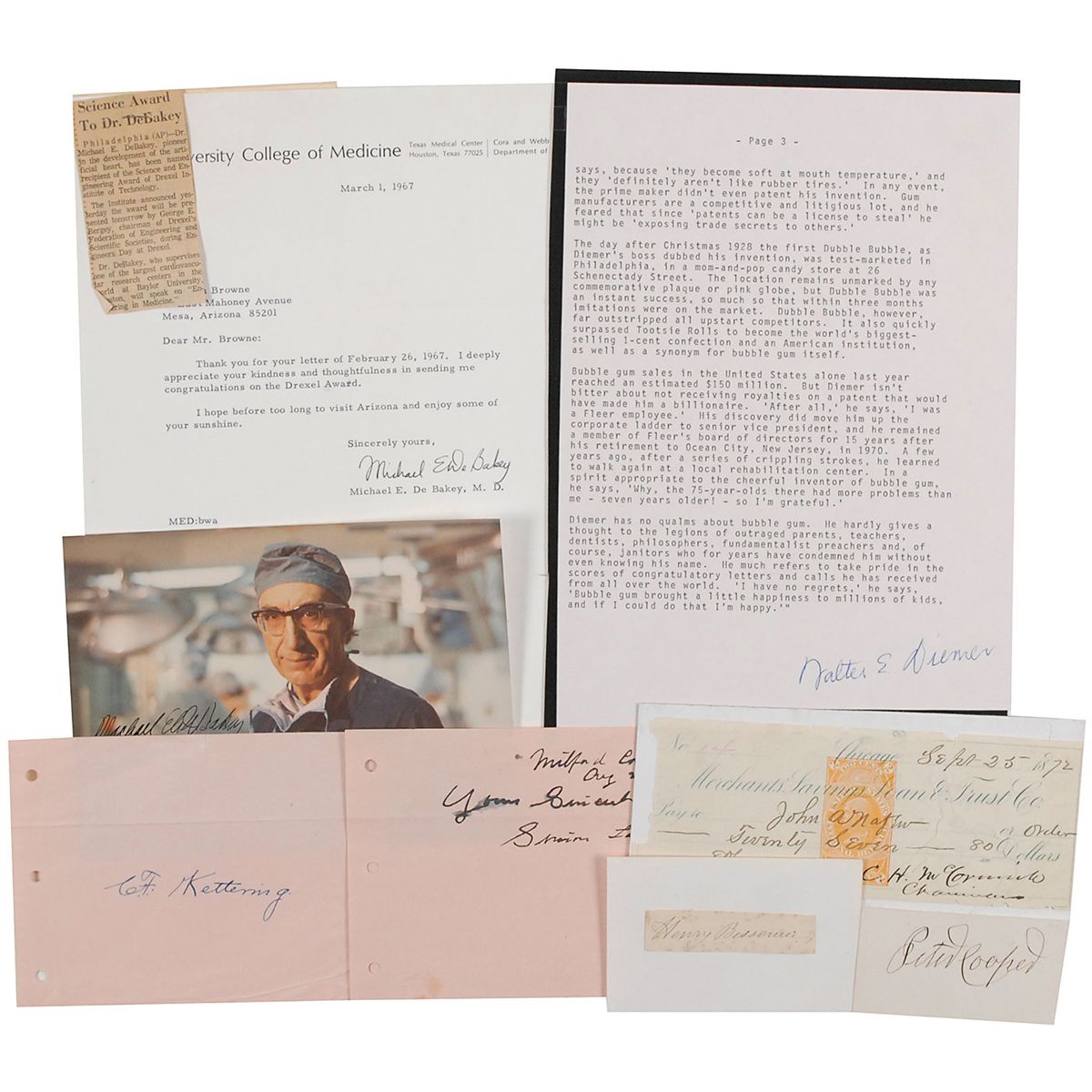 Collection of eight items, primarily consisting of signatures and letters, each signed by an inventor of some sort. Signers are: Henry Bessemer, Peter Cooper, Michael DeBakey (2), Walter Diemer, Charles F. Kettering, Simon Lake, and Cyrus Hall McCormick. In overall very good to fine condition.