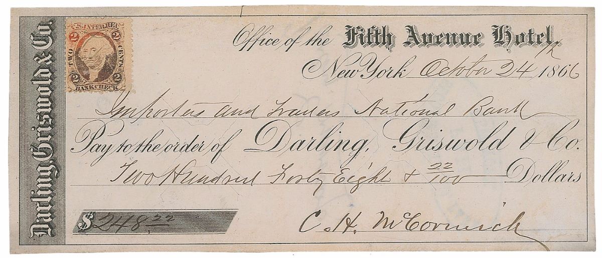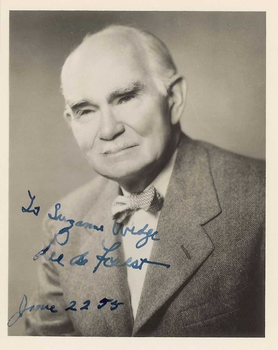 Collection of items signed by a trio of notable inventors: a matte-finish 3.5 x 4.5 head-and-shoulders photo of de Forest, signed and inscribed in fountain pen, “To Suzanne Widge, Lee de Forest, June 22 55”; a business check, 7.5 x 3.25, filled out in another hand and signed by Cyrus McCormick, “C. H. McCormick,” payable to Importers and Traders National Bank for $28.22, October 24, 1866; and a set of twenty-four ink signatures from Charles E. Duryea, “Chas. E. Duryea,” on individual off-white slips clipped from checks, each approximately 4.5 x .75. In overall fine condition.
