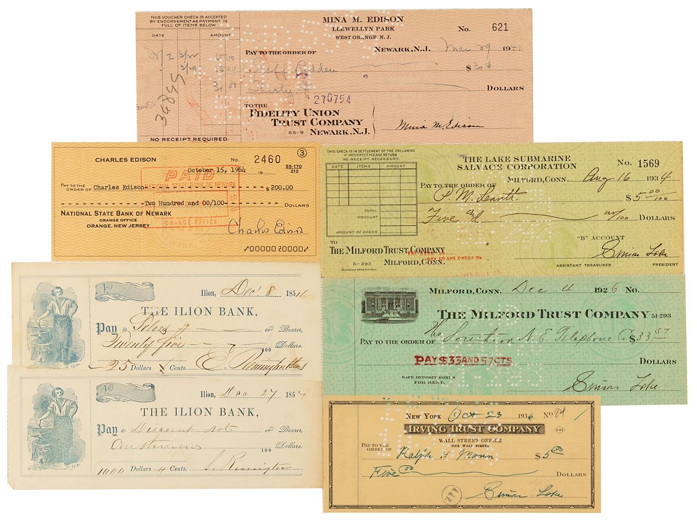 Seven checks signed by inventors and industrialists, dated from 1854 to 1964, including: Eliphalet Remington, Samuel Remington, Simon Lake (3), Mina Edison, and Charles Edison. In overall fine condition.