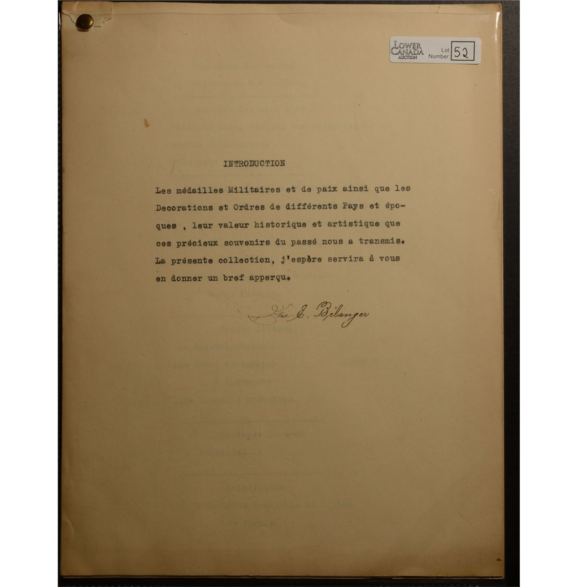Inventory of Charles E. Bélanger's collection of medals done by typewriter dated February, 1925, Original copy.