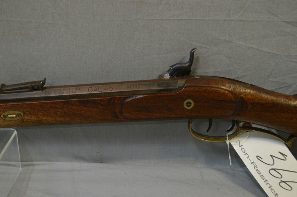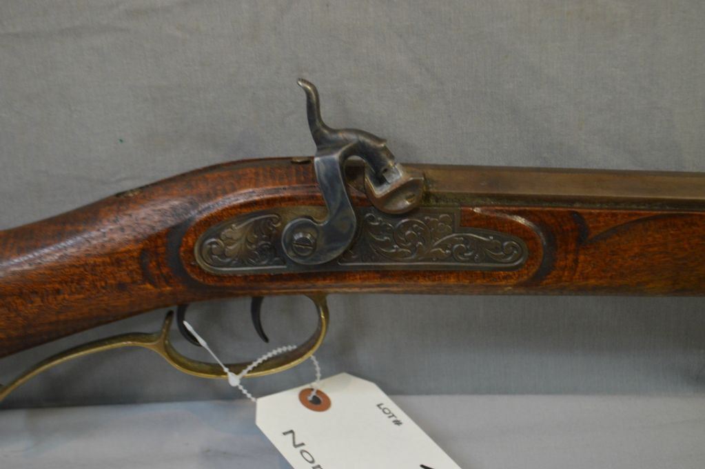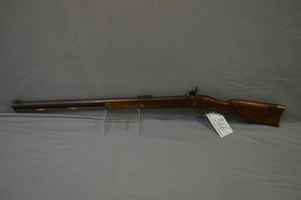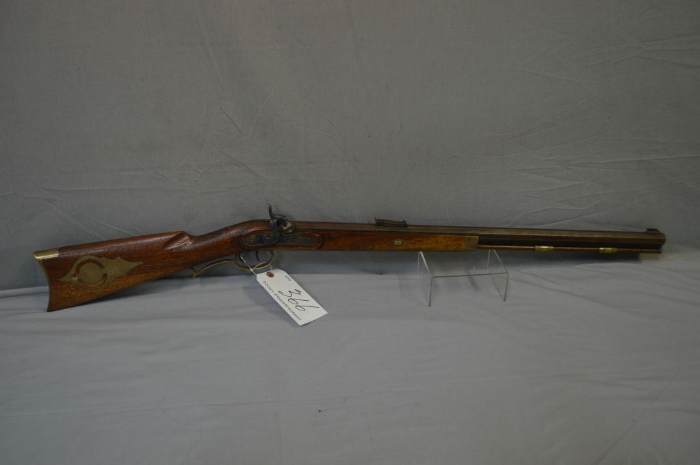 Investarm Model Hawken Percussion Rifle Reproduction .45 Perc Cal One Shot Rifle w/ 28" octagon bbl [ fading blue finish turning brown, brass furniture with some patina, case colored lock & hammer starting to fade, wooden half stocked stock with raised cheek piece, brass patch box, wooden ramrod, double set trigger ] Ser # 81666