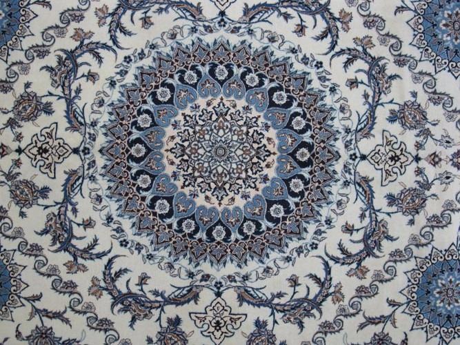 Investment Grade Super Fine Part Silk Nain-Isfahan Rug. Made of all natural, vegetable dye, hand woven, pure silk, and fine baby lamb's wool pile on cotton foundation. This royal Nain-Isfahan has a glowing baby lambs wool and silk pile with a lustrous appearance of utmost beauty. Please notice the lovely and impressive radiating sunburst central medallion, surrounded by what seems like the matrix of a Persian gardens. This fine Nain has about 250 knots per square inch and it takes about three years to create this rug. Please notice that the back of this rug looks as good as the front. The leather band sewn on the edge on the back of this rug is to prevent the edges from curling under due to the extreme tightness of the weave. Size: 12 feet 5 inches X 8 feet 4 inches.