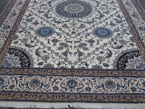 Investment Grade Super Fine Part Silk Nain-Isfahan Rug. Made of all natural, vegetable dye, hand woven, pure silk, and fine baby lamb's wool pile on cotton foundation. This royal Nain-Isfahan has a glowing baby lambs wool and silk pile with a lustrous appearance of utmost beauty. Please notice the lovely and impressive radiating sunburst central medallion, surrounded by what seems like the matrix of a Persian gardens. This fine Nain has about 250 knots per square inch and it takes about three years to create this rug. Please notice that the back of this rug looks as good as the front. The leather band sewn on the edge on the back of this rug is to prevent the edges from curling under due to the extreme tightness of the weave. Size: 12 feet 5 inches X 8 feet 4 inches.
