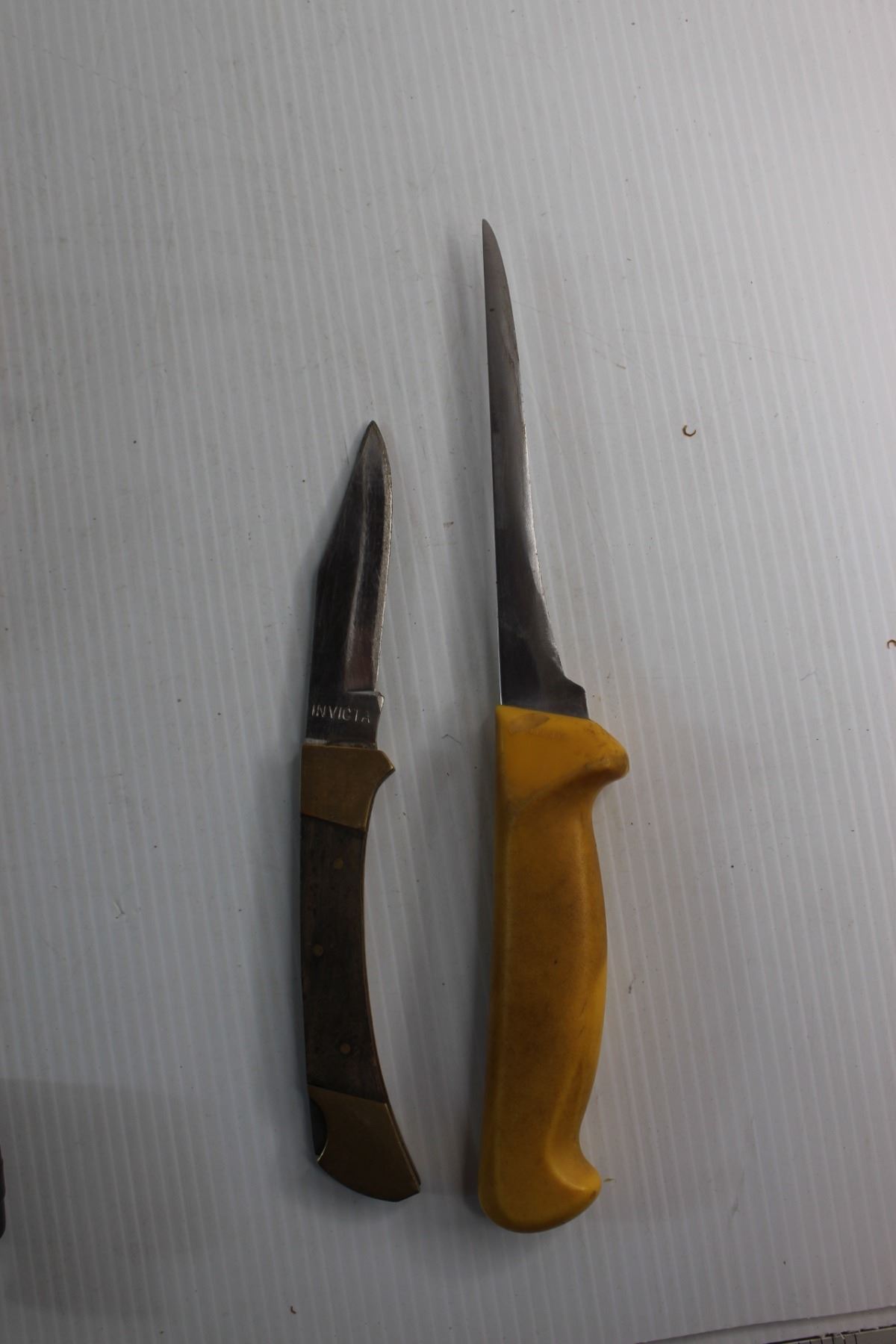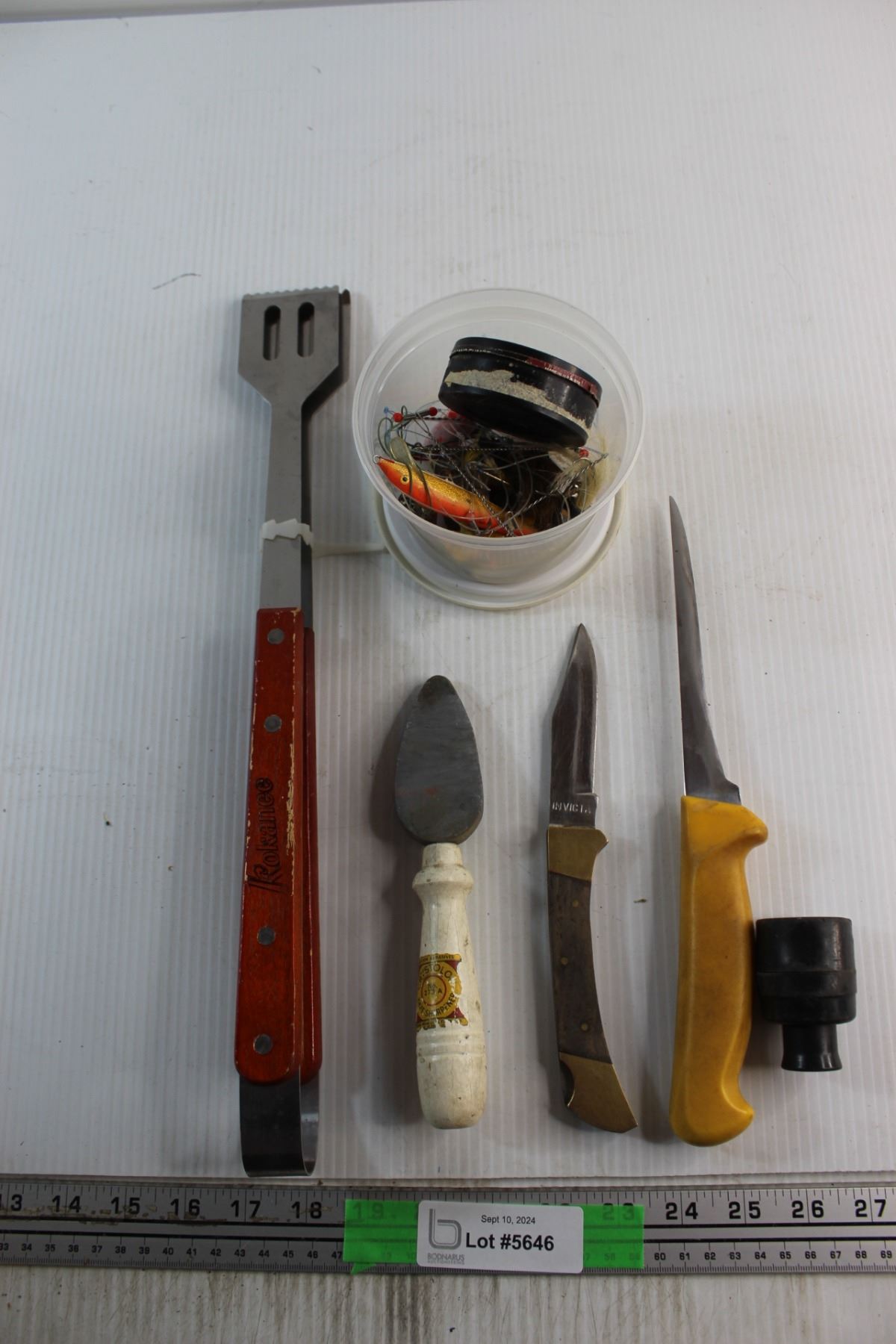 Invicta Folding Knife, Butcher Knife, Assorted Fishing Gear and Assorted Items
