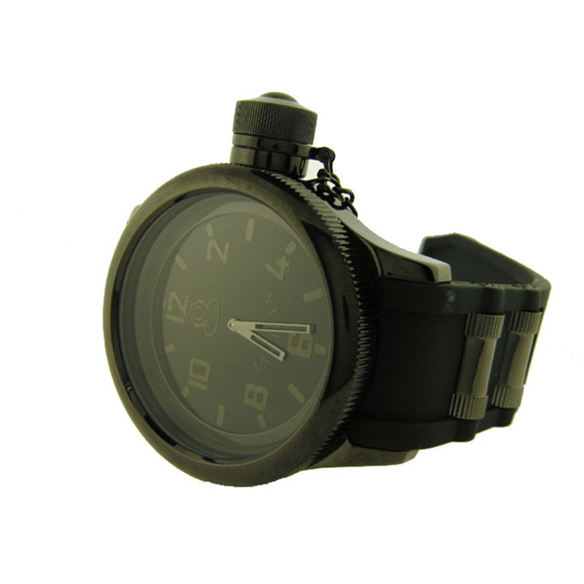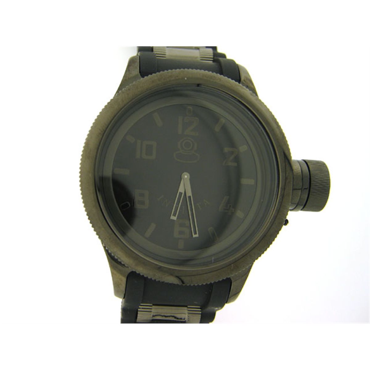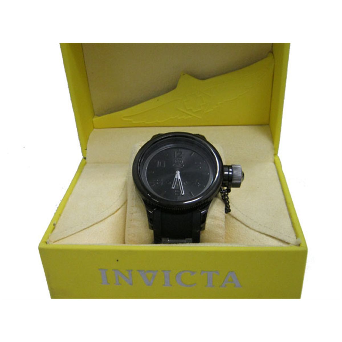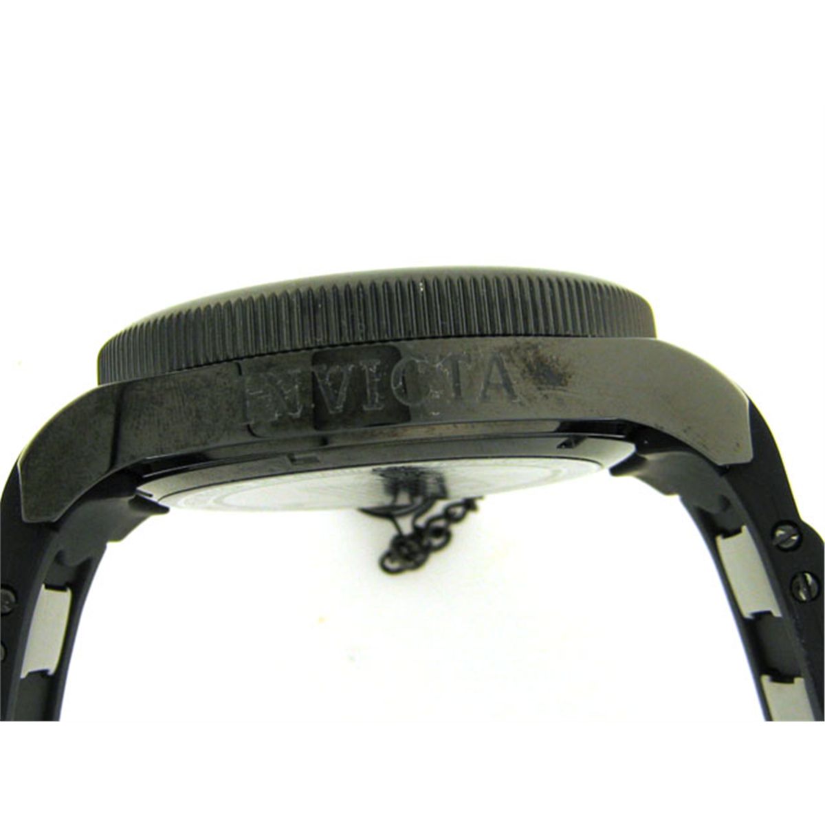 This is an Invicta Men's Diver Collection Combat Edition Black Polyurethane Watch with the following features: round black dial; black Arabic numerals and black indices marking the hours, with silver hands with black fill; coin-edged fixed bezel; durable mineral crystal; black polyurethane strap with a buckle clasp; black ion-plated stainless steel case; secured screw-down cap with a chain is attached to the crown; Swiss quartz movement; water resistant up to 330 feet (100 meters); 52 mm Case diameter; 15 mm Case Thickness; and 26 mm Band width.